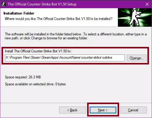 我们选择反恐精英的基准文件夹。我的目录是这样的:C:/Program Apps (x86)/Steam/steamapps/common/Half-Life/cstrike。完成此操作后,我们点击“下一步”