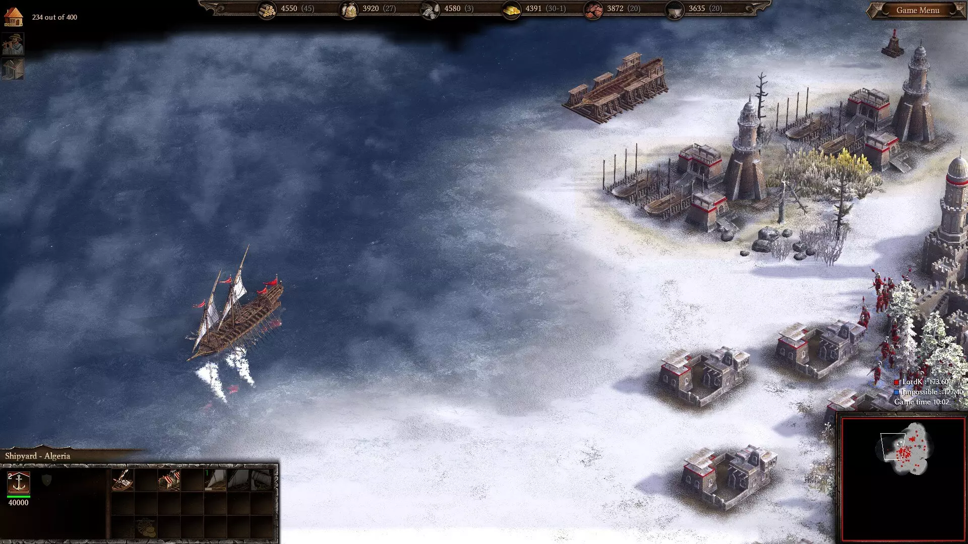 堪比查理五世的耻辱:奥斯曼的长枪兵冲锋在奥地利基地撕开了一条血腥之路。 无论你选择什么,全面进攻都是你唯一的选择。你没有值得一提的后期潜力,所以始终要优先考虑短期收益而非长期优化。记住,你拖延的每一秒都在让其他派系变得更强,所以放手去干吧。 转到水域地图,阿尔及利亚的早期游戏表现更为复杂。他们对造船厂和关键海军科技的伊斯兰折扣非常可观,加上城镇大厅带来的木材节省,使他们能比其他派系更早开始海军生产,但由于没有游艇,他们不得不立即建造更昂贵的桨帆船,这延误了他们在水域的存在感。这算不上严重的劣势——桨帆船比游艇更强——但在对抗其他早期进行海上扩张的国家时可能会遇到麻烦,尤其是乌克兰和同为伊斯兰国家的土耳其,它们能获得类似的折扣和强大的游艇。