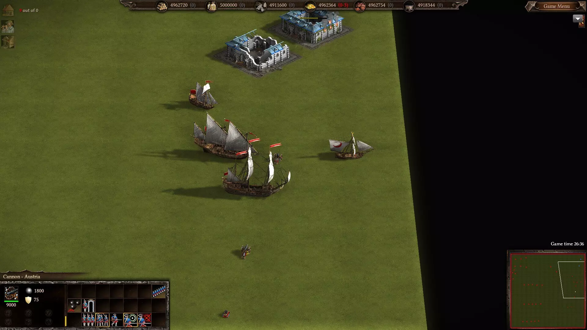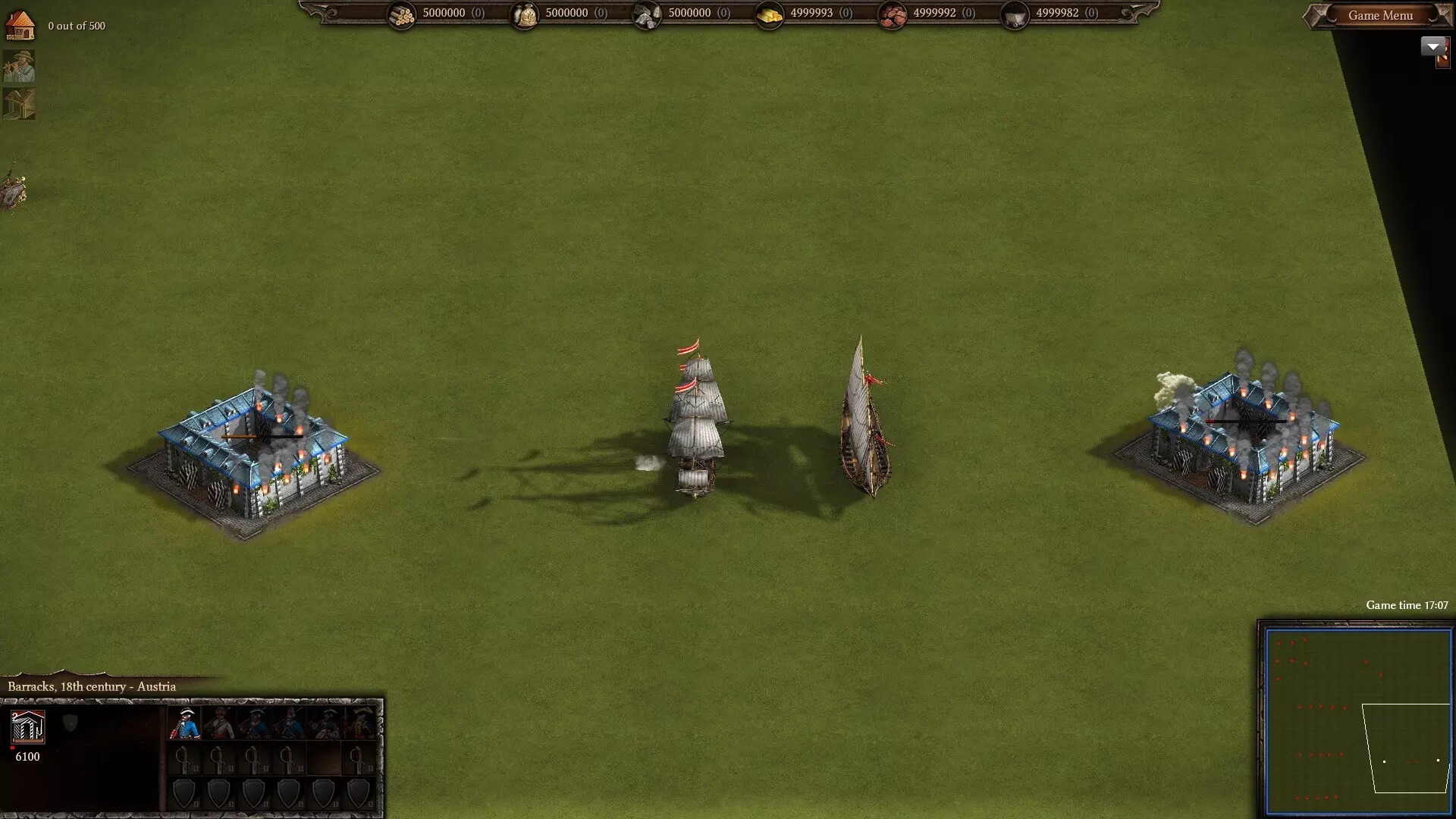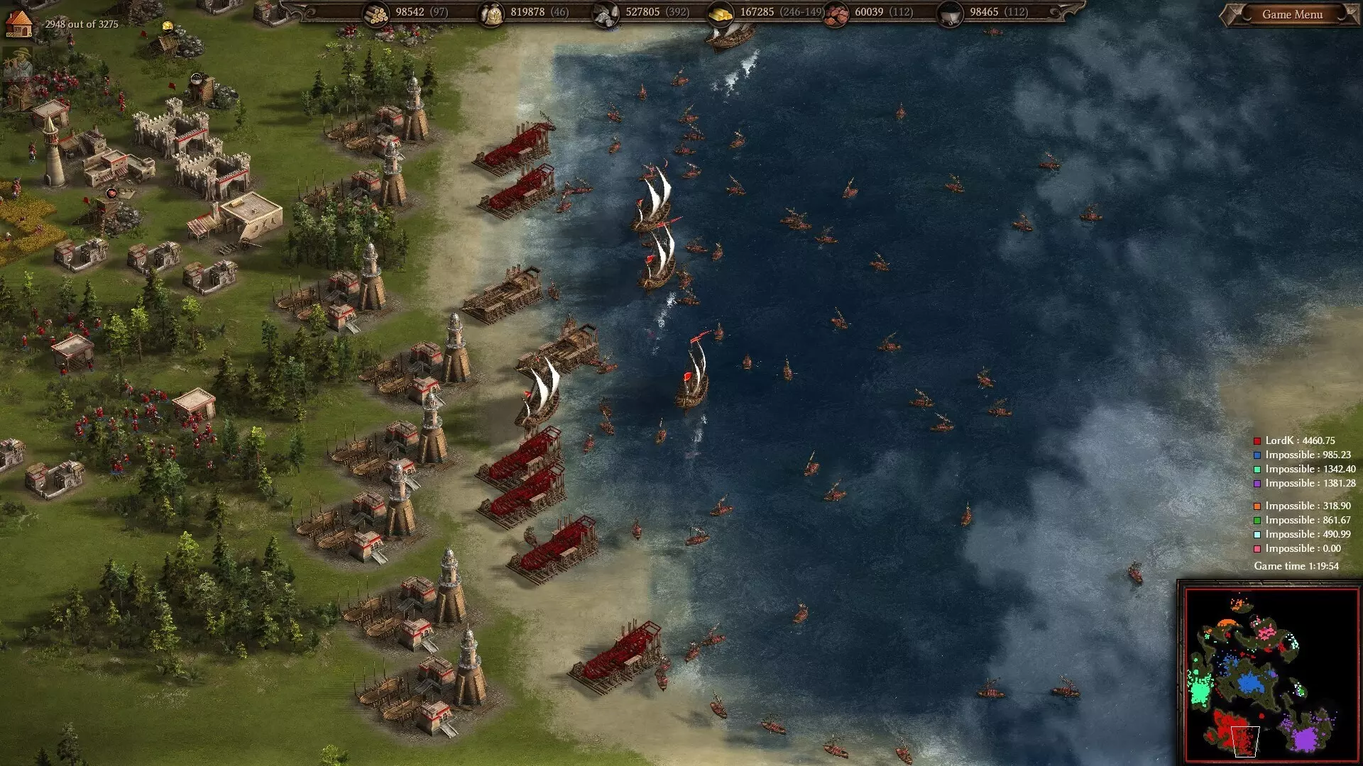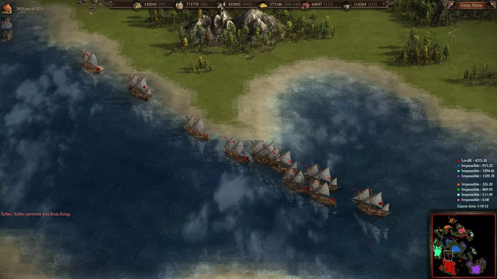 6艘护卫舰每秒的维护费用为1金币,而150艘三桅小帆船的维护费用与其中1艘护卫舰相同,即零费用。 在战斗力方面,三桅小帆船的射程比护卫舰短,但凭借15,000点额外生命值以及因火炮数量更多而带来的更快射速弥补了这一不足。这使得它们在岸轰方面可能稍逊一筹,因为其射程不够远(不过实际上,你确实应该使用加莱舰及其迫击炮来轰炸内陆建筑),但它们通过在海上的统治力弥补了这一点。 我未能找到关于三桅小帆船(或者其他任何独特船只)的许多确切细节,因此我不会罗列具体数据,而是提供一些我为测试三桅小帆船性能所截取的截图。