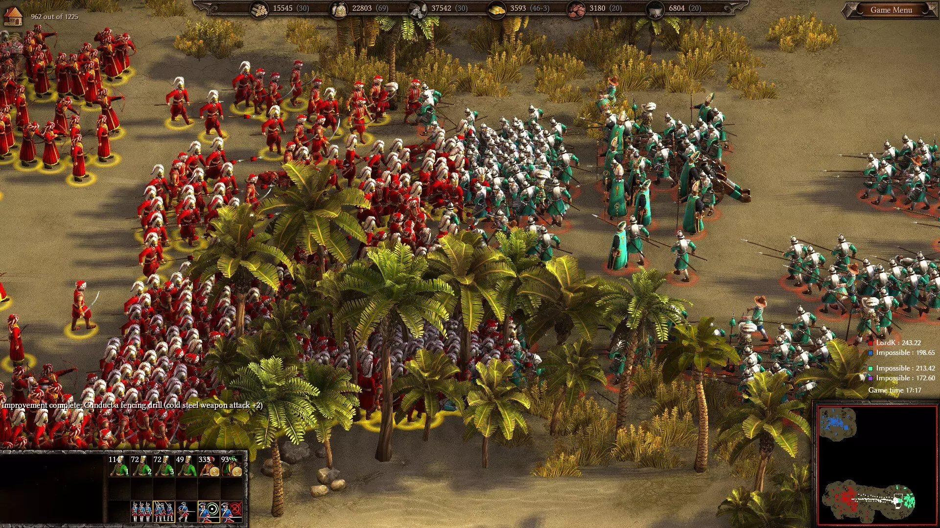 惩罚葡萄牙:弓箭手攻击敌方龙骑兵和火枪手,同时轻步兵担任阻滞部队。(另外,我忙着微操弓箭手以减少友军误伤,忘了让龙骑兵上前,所以他们就站在那儿围观战斗。我没什么好说的,就是觉得这事儿挺逗的。)马穆鲁克(17世纪)