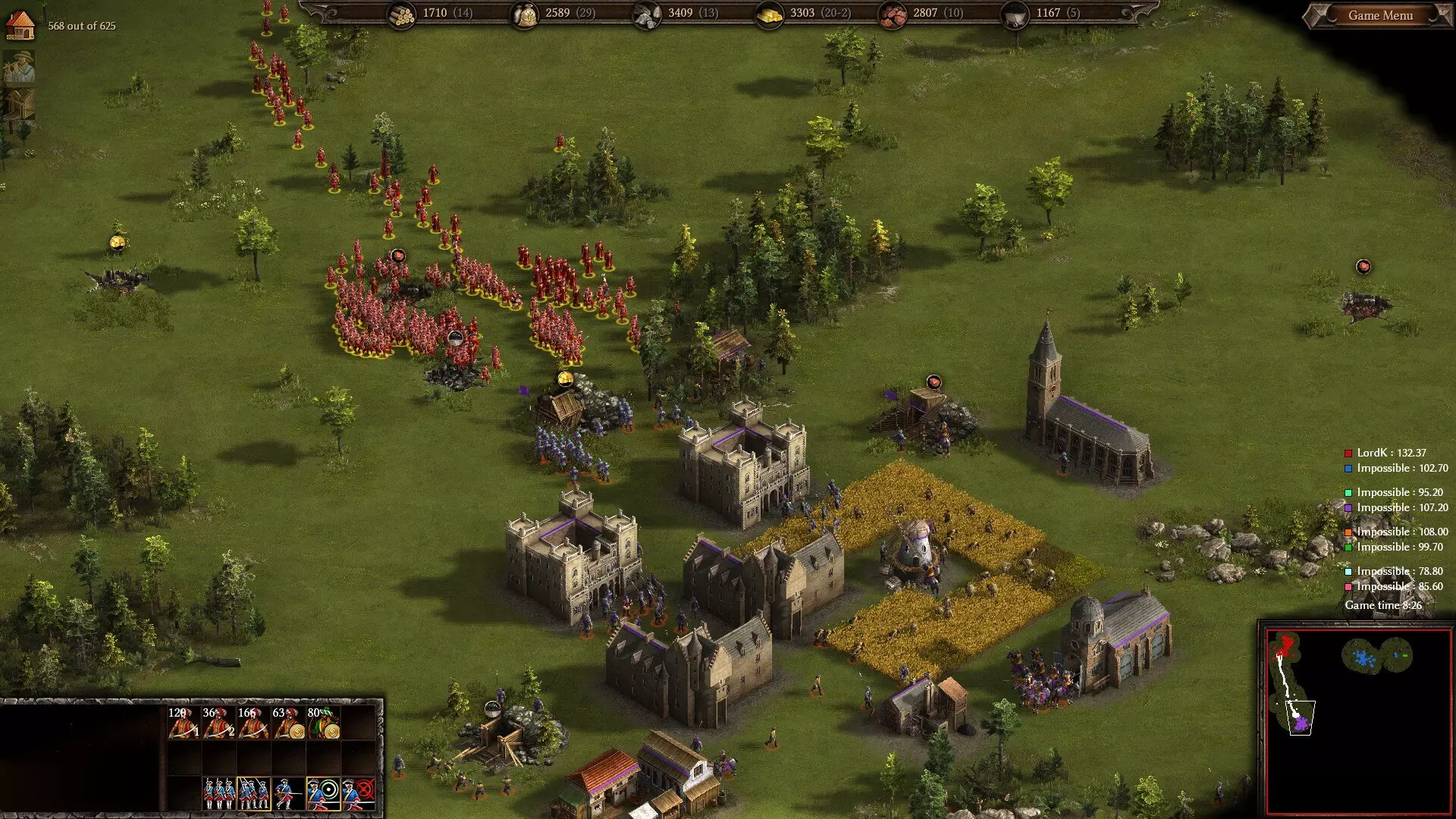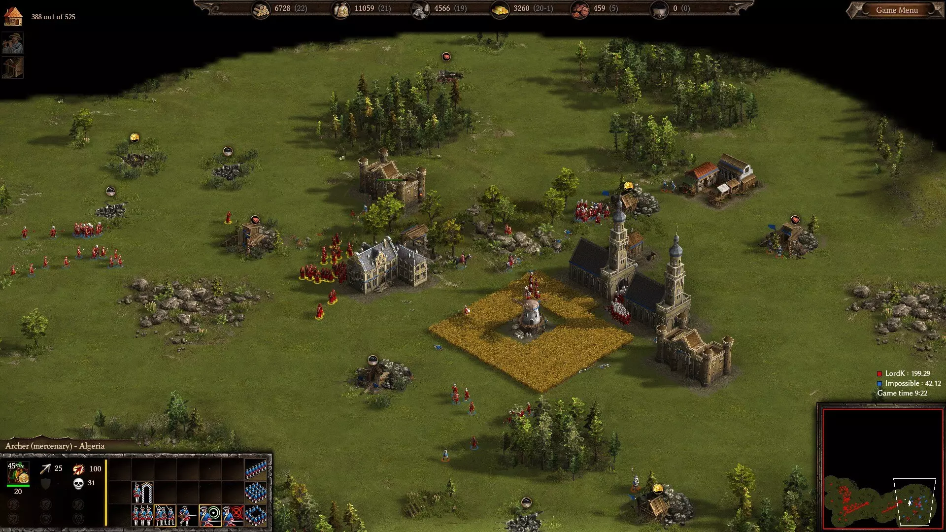 夺回佩尼翁:双方近战部队均已阵亡,弓箭手只能依靠数量对抗西班牙人的训练与纪律。即便是少量的科塞莱特步兵或轻骑兵,对这支阿尔及利亚部队而言也极难应对。 遗憾的是,与所有弓兵单位一样,弓箭手存在诸多问题。其固有的不准确性以及造成友军误伤的可能性,使得他们很难在消灭逼近的近战部队的同时,保证己方阻挡部队的存活(尤其是考虑到你方所有部队均缺乏箭防)。一旦一队 pikemen 或骑兵接近弓箭手,对他们乃至你的整个军队而言,通常就意味着游戏结束。reiter骑兵和快速骑兵尤其危险,前者凭借厚重的盔甲可以无视你的箭矢,同时屠杀你的阻挡部队;后者则能迅速接近,弓箭手除非运气极好否则很难命中。 这给军队配置带来了难题:你需要大量近战部队来弥补弓箭手造成的友军伤害,但获得这些近战部队的唯一方法是在兵营中与弓箭手一起训练轻步兵。这迫使你投入两条升级路线,尽管阿尔及利亚因兵营科技有折扣而成本低得多,但这仍然很麻烦,并且会消耗你的经济。我认为你的军队中弓箭手的数量绝不能超过近战部队,否则你将无法应对弓箭手的众多克制单位。 总而言之:弓箭手是一种特殊单位,需要非常特定的条件——大量敌方远程单位和少量近战部队——才能发挥良好。很难推荐它们优于更可靠的轻步兵同类单位(更不用说雇佣兵龙骑兵和掷弹兵了),而且在我认真对待的游戏中不会使用它们。不过,如果你喜欢用大量古老的弓箭手压制现代火枪手,并且不介意你的军队在面对不同部队配置时表现极不稳定(记住:近战骑兵=弓箭手的末日),可以尝试使用它们,看看是否适合你。