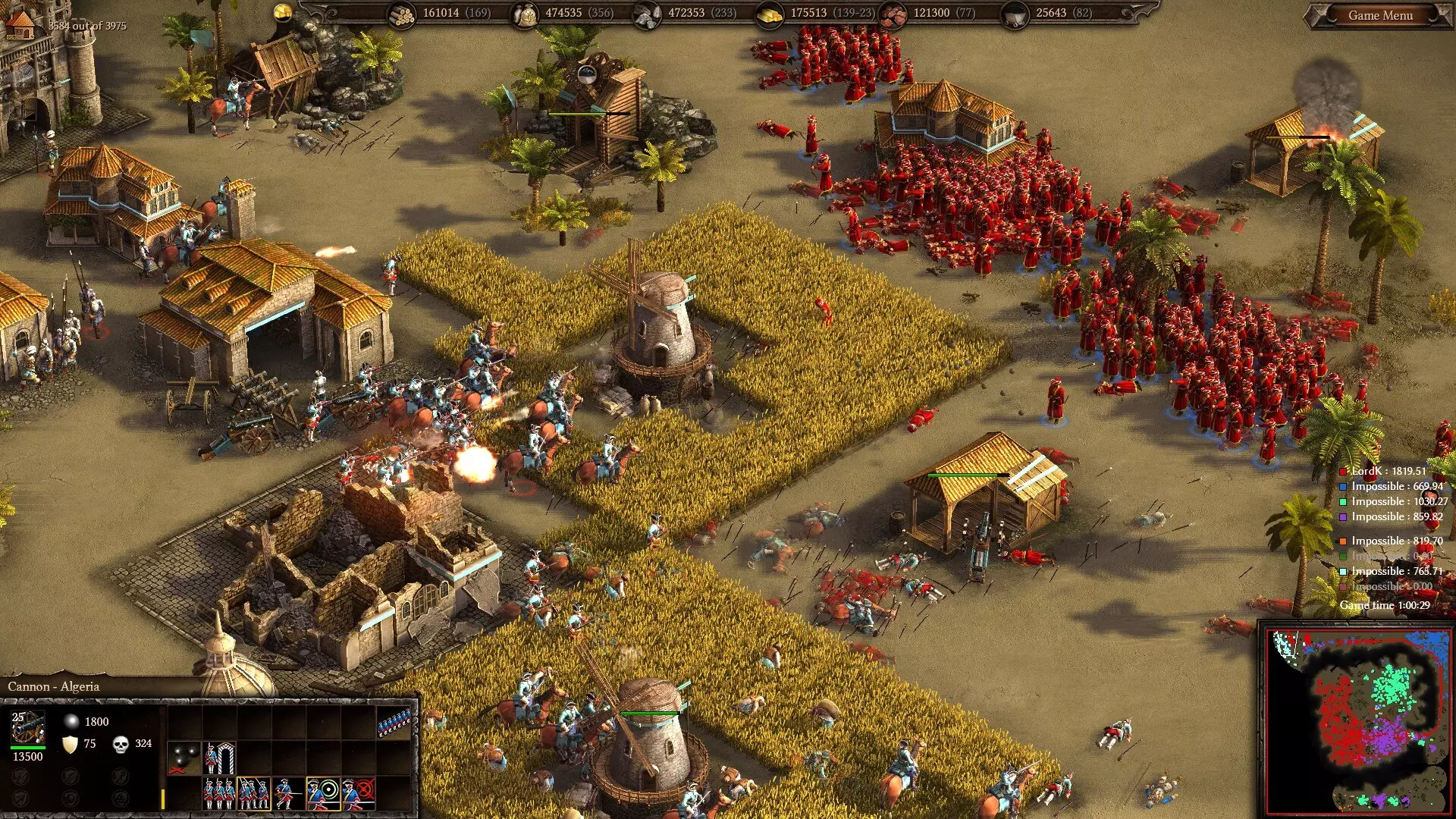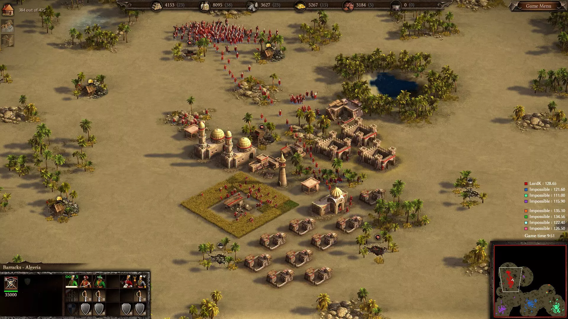 奴隶贩子的巢穴与流亡者的避难所:一个早期的阿尔及利亚基地。 这就是:你们想要一个速攻派系,现在你们得到了。 阿尔及利亚专注于游戏初期的进攻,因此你应该尽快攻击敌人。大量廉价的建筑和科技为你提供了帮助,让你能够比欧洲派系更早建立基地和经济,并开始组建军队。你有多种步兵选择,不过总结如下:奥斯曼 pikemen 早期更容易发挥作用,前提是你能快速建造第三个兵营(理想情况下在外交中心之后);轻步兵在中期的战斗力更强,但由于生产速度快,早期使用起来更有难度;弓箭手只有在敌人拥有大量火枪手且近战单位很少时才有用(这种情况非常罕见)。