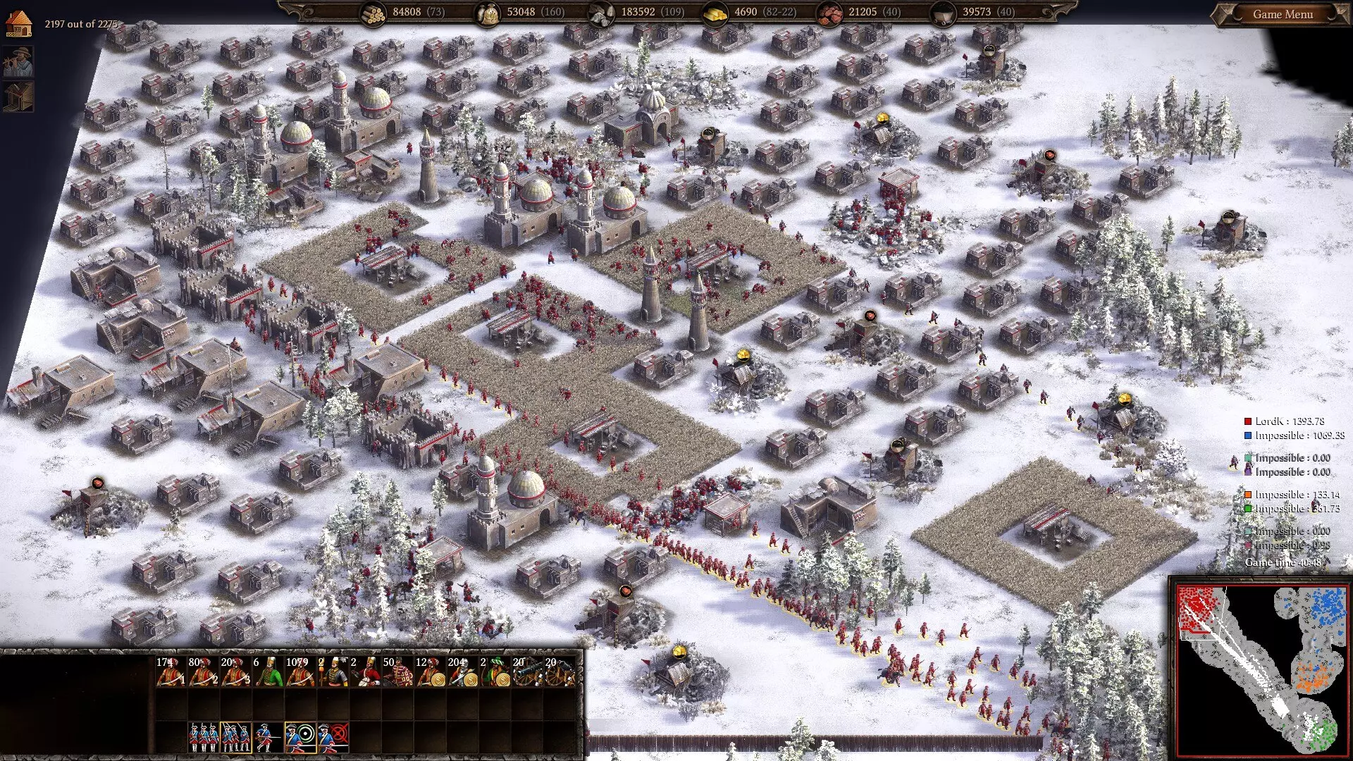 蜂拥而上,冲向莫斯科人!阿尔及利亚轻步兵和马穆鲁克(还有一些苏格兰盟友)涌入一座俄罗斯城镇的街道,手持滑膛枪的雇佣兵提供火力支援。 使用轻步兵唯一的难点在于开局。由于他们训练速度极快,往往会给你早期较低的人口上限带来压力,这很烦人,还可能让你无法征召足够的农民来发展经济(因此,在预计会快速结束的低和平时期游戏中,训练速度较慢的奥斯曼 pikemen 更常被选用)。话虽如此,如果你发动攻击非常迅速,轻步兵还是能发挥作用的。通过在战斗中不断承受损失,你可以为更多农民和雇佣兵腾出人口空间,让经济得以发展,同时尽情暴兵。 游戏中期会变得有些艰难,因为敌人的剑甲开始成为问题。你可以通过将轻步兵组成阵型来获得+2或+3的攻击力加成,并在部队中加入雇佣兵龙骑兵(如果资金紧张的话可以用掷弹兵)和马穆鲁克来应对。用这些单位来对付那些重甲敌人,同时让轻步兵牵制并消耗敌军的其他部队。这个时期的损失会更大,但你仍然可以非常快速且轻松地重建部队。