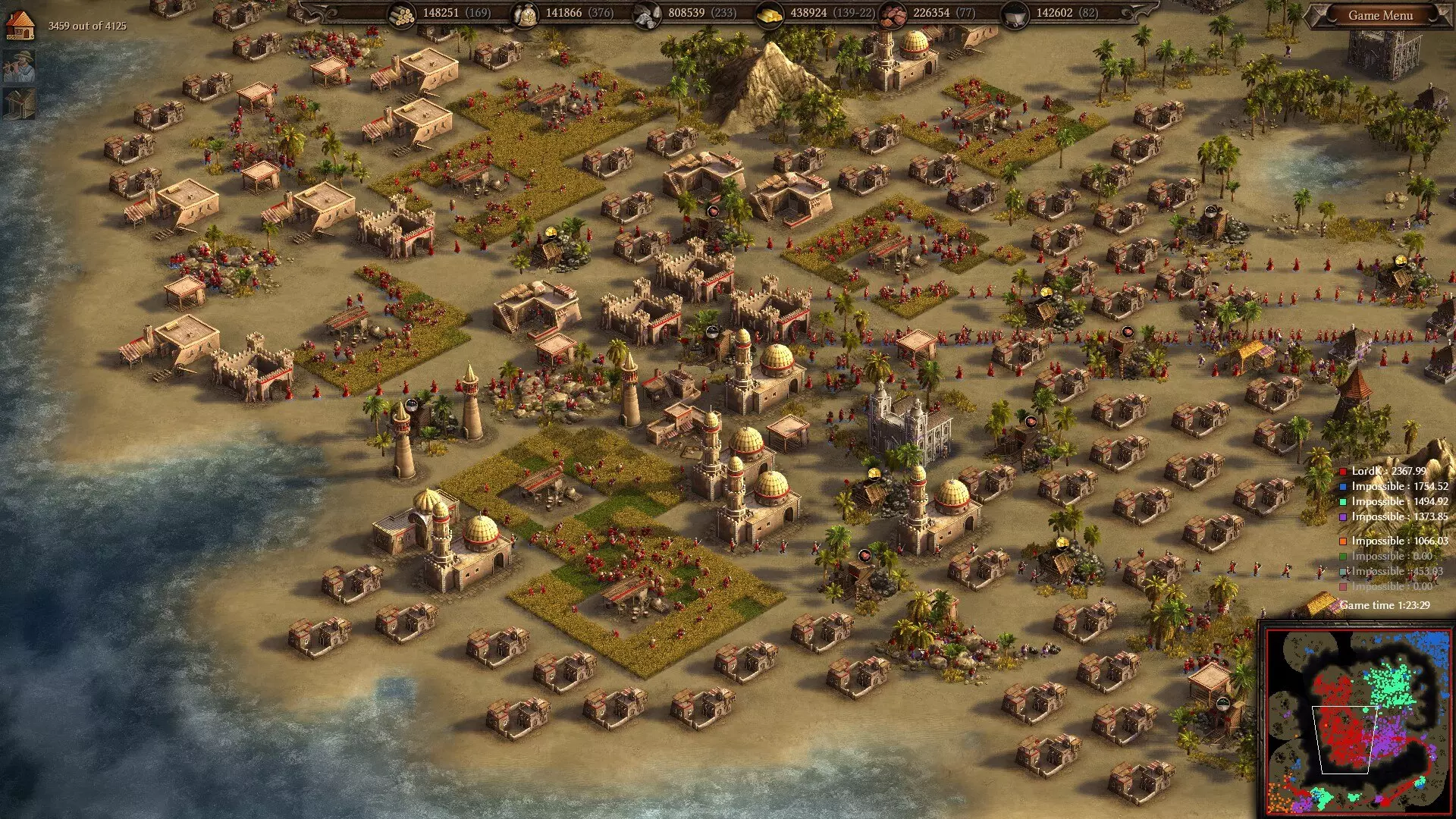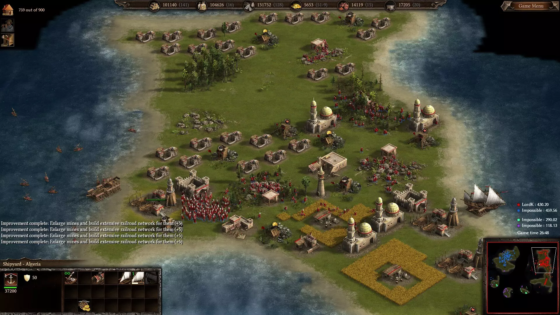 剑指贡赋:游戏中期的阿尔及利亚基地 随着18世纪的临近,阿尔及利亚的相对实力正逐渐衰退,敌方火枪手的崛起以及更高的近战护甲正不断削弱其步兵的作战效能。不过,你尚未黔驴技穷,通过添置 artillery(火炮)、Mamelukes(马穆鲁克骑兵,此时你已有资金对其进行升级),再加上Mercenary Dragoons(雇佣龙骑兵)或Grenadiers(掷弹兵),你仍能组建起强大的军团。 由于你缺少最后一项农业科技及其带来的180%效率大幅提升,因此或许应将资源采集的重心转向其他资源以实现收入最大化。尽量开采石料并建造渔船。此外,升级金矿以便负担得起你将要招募的大量雇佣兵。在水域地图中,情况甚至更加有利。随着坚韧且射速快的【三桅小帆船】和强大的【战列舰】的加入,阿尔及利亚可以使其舰队变得更加致命。由于他们在舰船建造速度科技上享有大幅折扣,他们甚至比欧洲对手更早拥有这样的舰队,能够比除土耳其之外的其他派系更早打造一支强大的后期舰队。