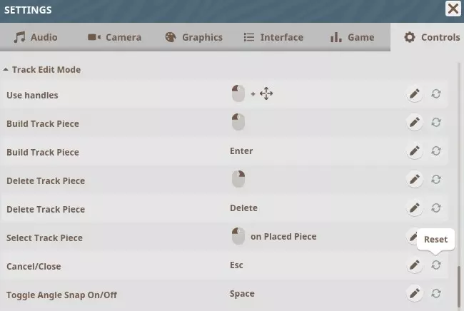 轨道编辑模式 使用控制柄:左键+移动鼠标 放置轨道段:左键 放置轨道段:回车 删除轨道段:右键 删除轨道段:删除键 选择轨道段:左键点击已放置轨道段 取消/关闭:ESC 切换角度吸附开关:空格