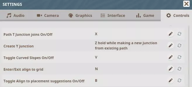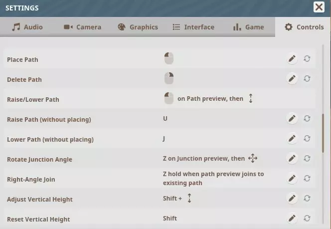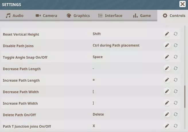 路径编辑模式 放置路径 – 鼠标左键 删除路径 – 鼠标右键 抬高/降低路径 – 鼠标左键点击路径预览后按上下方向键 抬高路径(不放置)– U键 降低路径(不放置)– J键 旋转路口角度 – 在路口预览时按Z键后移动鼠标 直角连接 – 当路径预览与现有路径连接时按住Z键调整垂直高度 – Shift + ↕ 重置垂直高度 – Shift 禁用路径连接 – 放置路径时按住CTRL 切换角度吸附开关 – Space 减少路径长度 – (-) 增加路径长度 – = 减少路径宽度 – [ 增加路径宽度 – ] 删除路径开关 – Del 路径T型路口连接开关 – X 创建Y型路口 – 从现有路径创建新路口时按住Z 切换曲线坡度开关 – V 出入口对齐网格 – N 切换对齐放置建议开关 – B
