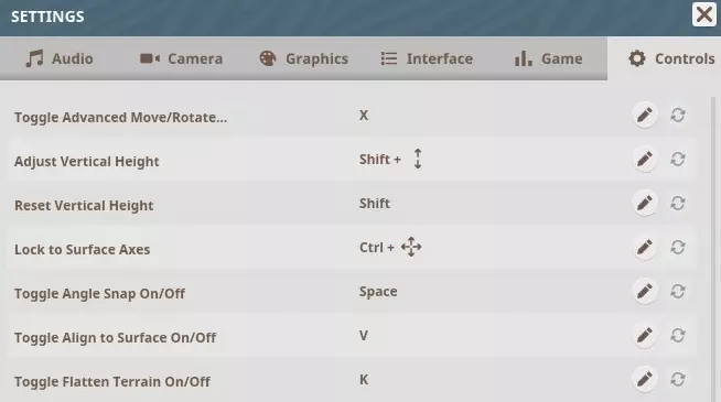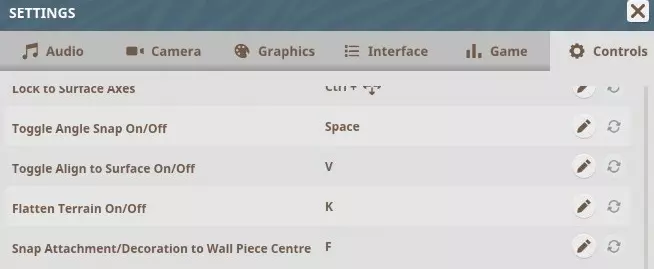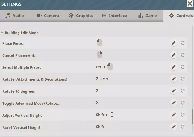建筑编辑模式 放置部件 - 鼠标左键 取消放置 - 鼠标右键 选择多个部件 - 左Ctrl + 鼠标左键 旋转(附件和装饰)- Z + 左右方向键 旋转90度 - Z 切换高级移动/旋转 - X 调整垂直高度 - 左Shift + 上下方向键 重置垂直高度 - 左Shift 锁定到表面轴 - 左Ctrl + 移动鼠标 切换角度吸附开关 - 空格 切换表面对齐开关 - V 切换地形平整 - K