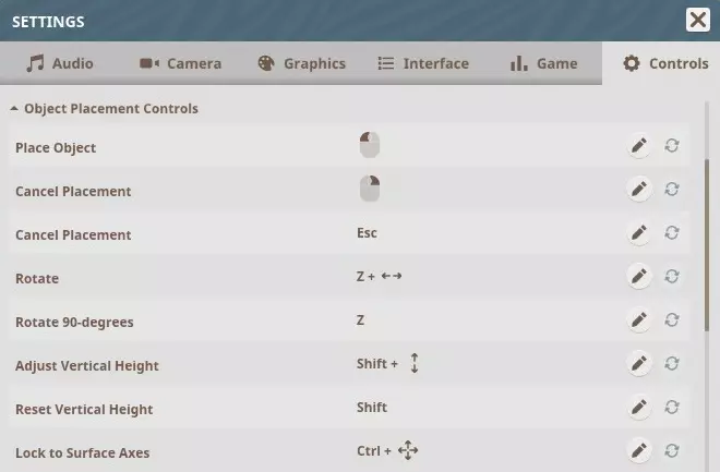 物体放置控制 放置物体 - 鼠标左键 取消放置 - 鼠标右键 取消放置 - ESC键 旋转 - Z键 + 左右方向键 旋转90度 - Z键 调整垂直高度 - Shift键 + 上下方向键 重置垂直高度 - Shift键 锁定到表面轴 - Ctrl键 + 移动鼠标 切换角度吸附开关 - 空格键 切换表面对齐开关 - V键 切换地形平整开关 - K键 将附件/装饰品吸附到墙壁部件中心 - F键