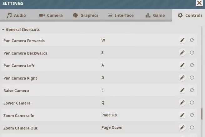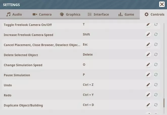 通用快捷键 平移摄像机向前 - W 平移摄像机向后 - S 平移摄像机向左 - A 平移摄像机向右 - D 升高摄像机 - E 降低摄像机 - Q 拉近摄像机 - Page Up 拉远摄像机 - Page Down 开启/关闭自由视角摄像机 - T 提高自由视角摄像机速度 - Shift 取消放置、关闭浏览器、取消选择对象 - ESC 删除选中对象 - DEL 更改模拟速度 - O 暂停模拟 - P 撤销 - CTRL + Z 重做 - CTRL + Y 复制对象/建筑 - CTRL + D 移动选择 - M 进入组编辑模式 - R 显示/隐藏用户界面 - G 摄像机手电筒 - L