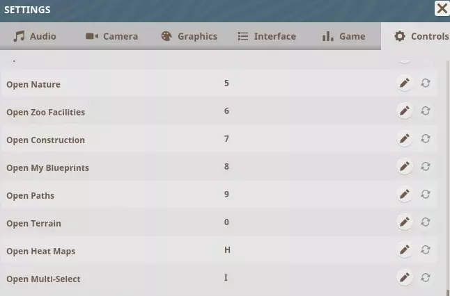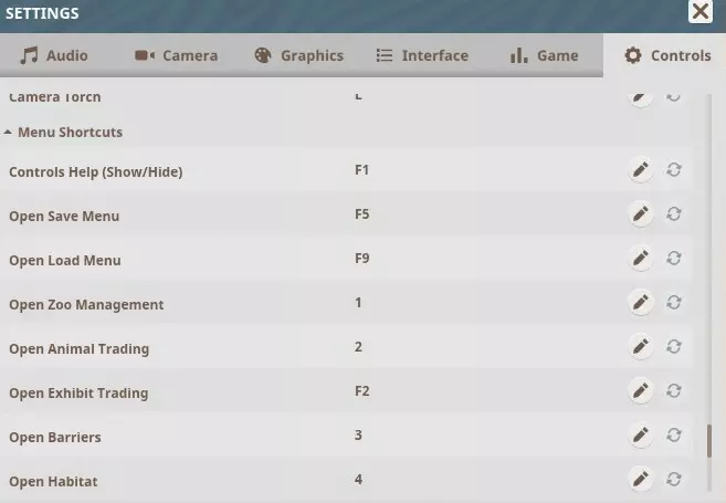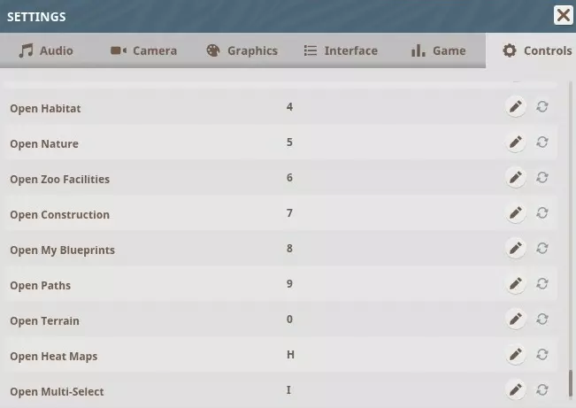 菜单快捷键 控制帮助(显示/隐藏)– F1 打开保存菜单 – F5 打开加载菜单 – F9 打开动物园管理 – 1 打开动物交易 – 2 打开展区交易 – F2 打开围栏 – 3 打开栖息地 – 4 打开自然环境 – 5 打开动物园设施 – 6 打开建造 – 7 打开我的蓝图 – 8 打开路径 – 9 打开地形 – 0 打开热力图 – H 打开多重选择 – I