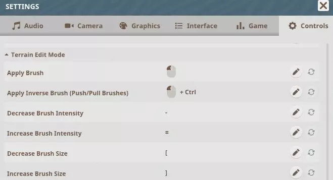 地形编辑模式 应用画笔 – 鼠标左键 应用反向画笔(推/拉画笔)– 鼠标左键 + Ctrl 降低画笔强度 – (-) 提高画笔强度 – (=) 减小画笔尺寸 – ([) 增大画笔尺寸 – (])
