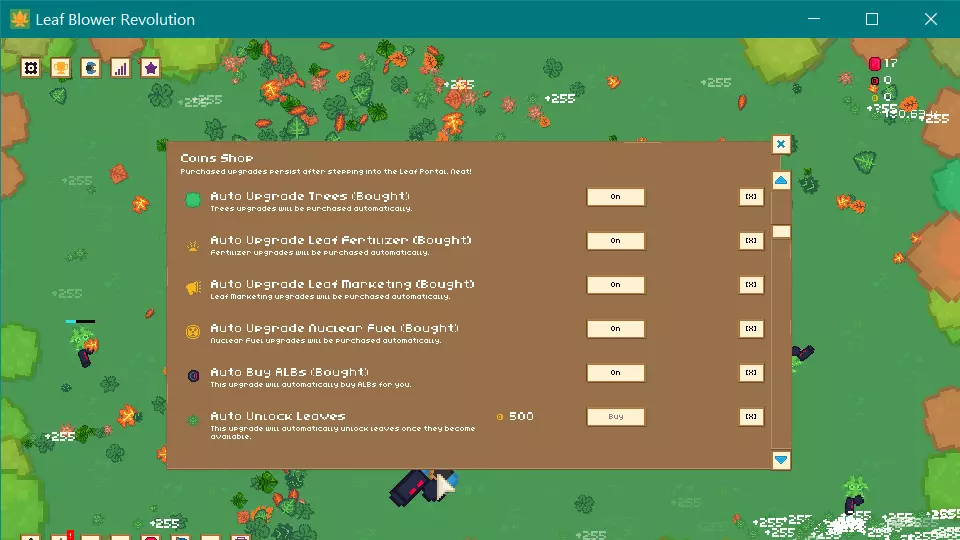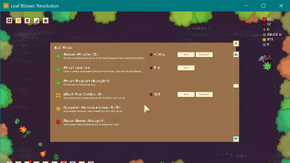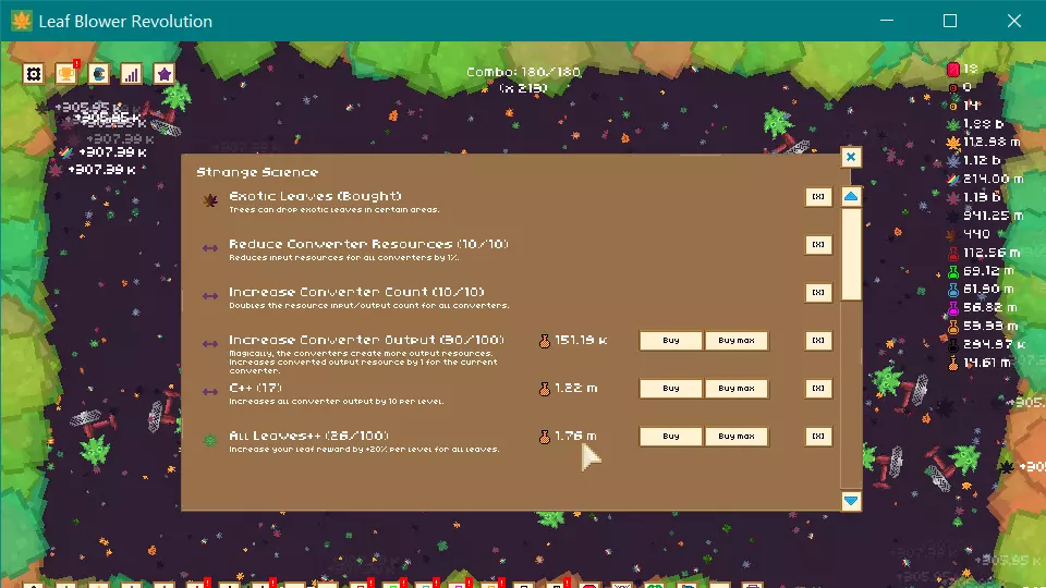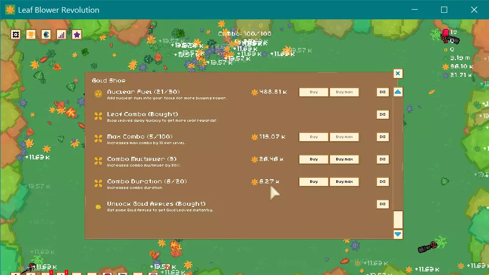 那么,那个核燃料看起来很诱人,但先别急着买,只有当你要清理更难的叶子(比如金色叶子)时它才好用,而你应该在能负担得起的时候就去获取金色叶子。一定要购买叶子传送门,这是未来进度的必要条件。一旦拥有了它,就避免进行 prestige,你需要至少存够100枚金币。(不过我之前 prestige 过,所以存了1.2K,哈哈)