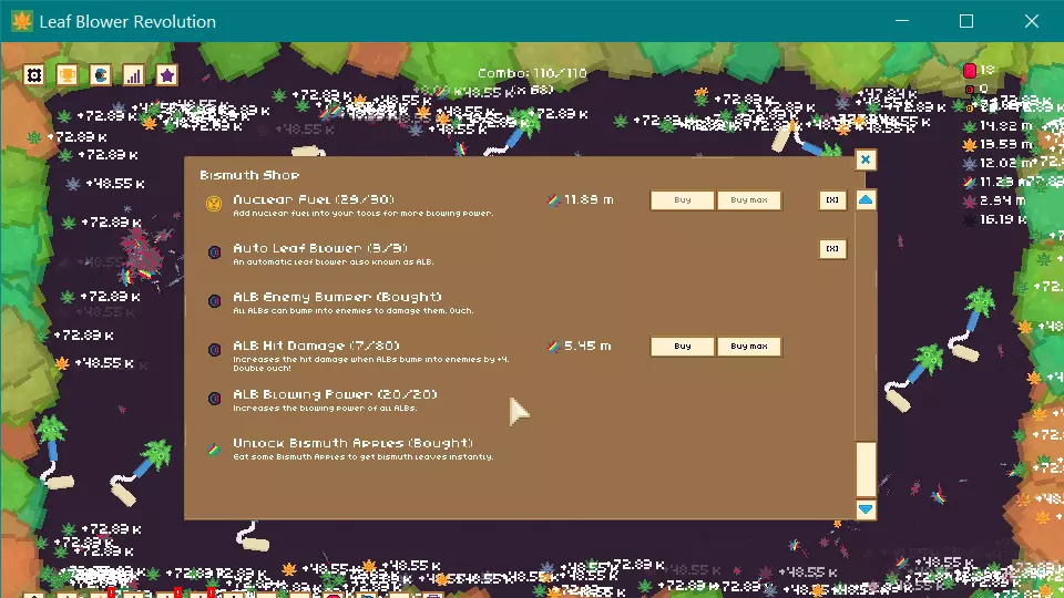 可能你不小心在余额中没有足够金币的情况下进行了 prestige( prestige 指游戏中的声望重置机制),等金币积累到 500 左右时,尝试解锁其余区域。一个好主意是尽可能深入到虚空区域,这样你就能为更快解锁其他叶子做好准备。 到这个阶段,你应该已经拥有铋叶了。这类叶子有一些对提升 boss 伤害至关重要的东西,即 ALB 命中伤害和 ALB 敌人碰撞器,这样你的扫地机器人就能清理掉叶子之外的更多东西了。