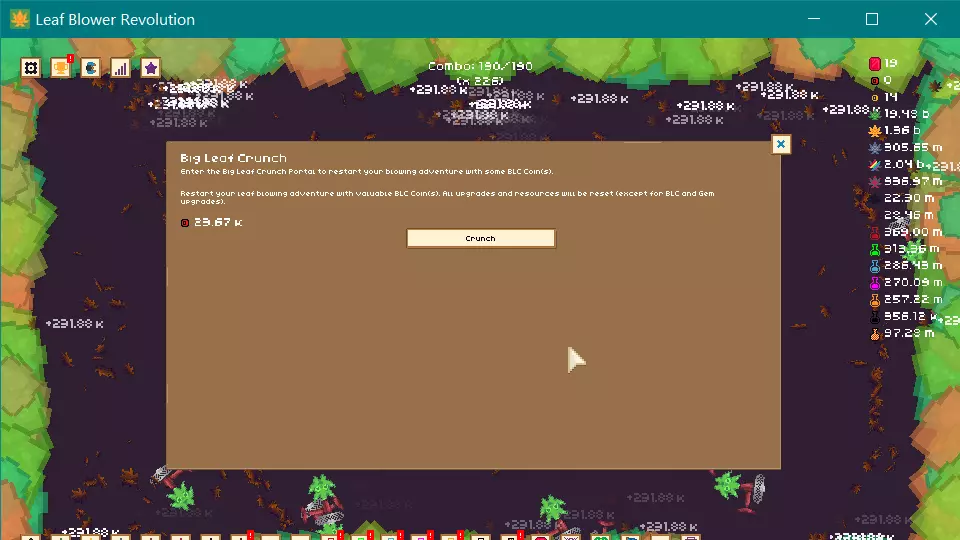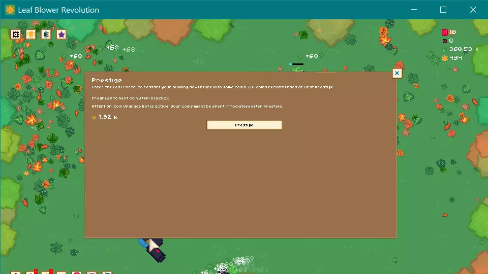当你拥有大约10K大叶子币可供 prestige 时,就进行 prestige 操作。确保尽快购买自动硬币升级,这样当你进行基础硬币 prestige 时,它会自动解锁硬币商店(不是 BLC 商店)中你需要的物品。在此之后,你所能做的就是让游戏保持 AFK 状态,所以去散散步,整理一下你自己或邻居的草坪,享受生活吧!(即使处于封锁状态,你也会找到一些事情做) 如果你在这之后仍然对游戏感兴趣,并且希望我继续编写指南,请告诉我,我会着手与其他人合作创作接下来的几个部分。(尤其是因为我还没有解锁天体叶子呢,哈哈)
