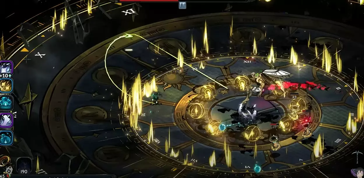 【Faz Faz片段】 时钟指针攻击的设计本应只需要你闪避一次,所以只要时机允许就冲刺穿过它,之后就不用再管了。你甚至不需要精准把控时机,因为冲刺的距离非常短。 还有一种很滑稽的攻击,你站着不动就能躲开。这绝对有《哈迪斯》中激光攻击的影子,但场面效果却不及后者的一半。克洛诺斯(Chronus)就像个绅士,会给你足足一秒钟的反应时间。