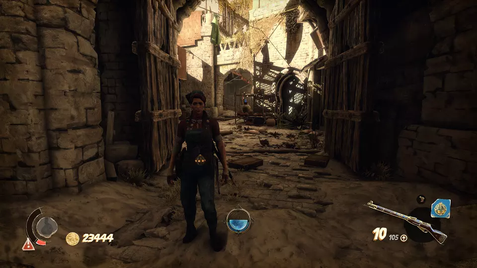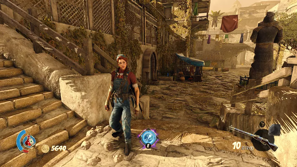 遗物(6/6) 用圣甲虫钥匙开门,来到街道。向左走到平台上,射击开关,然后及时跑到之前放第三本日记的院子里。