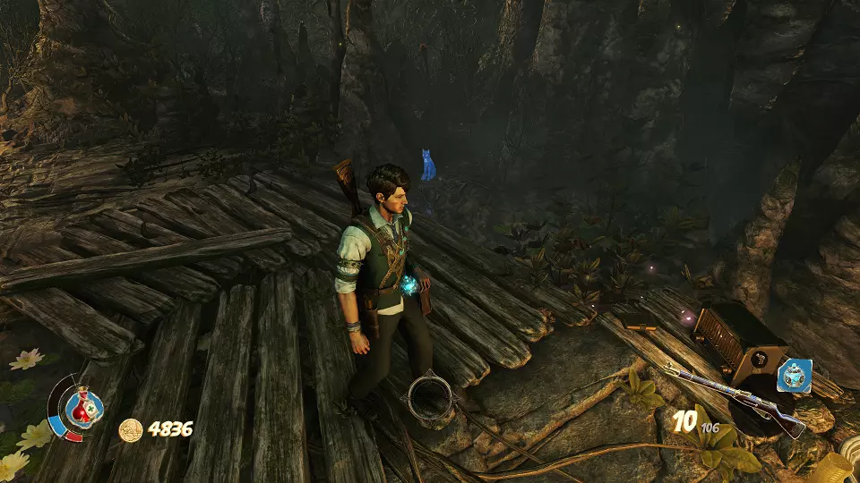 猫咪雕像(1/6) 日记(1/5) 穿过路障和桥上的战斗后,你会来到本关卡的第一个陷阱处。陷阱左侧的箱子里放着日记,右侧的柱子上则有猫咪雕像。