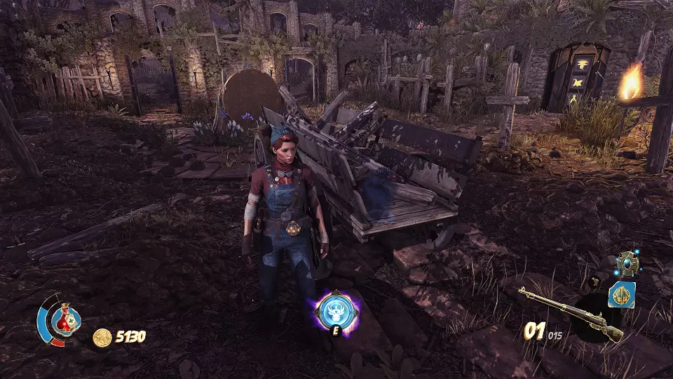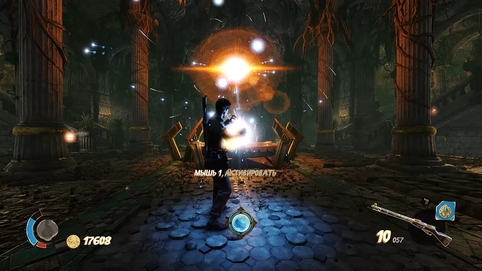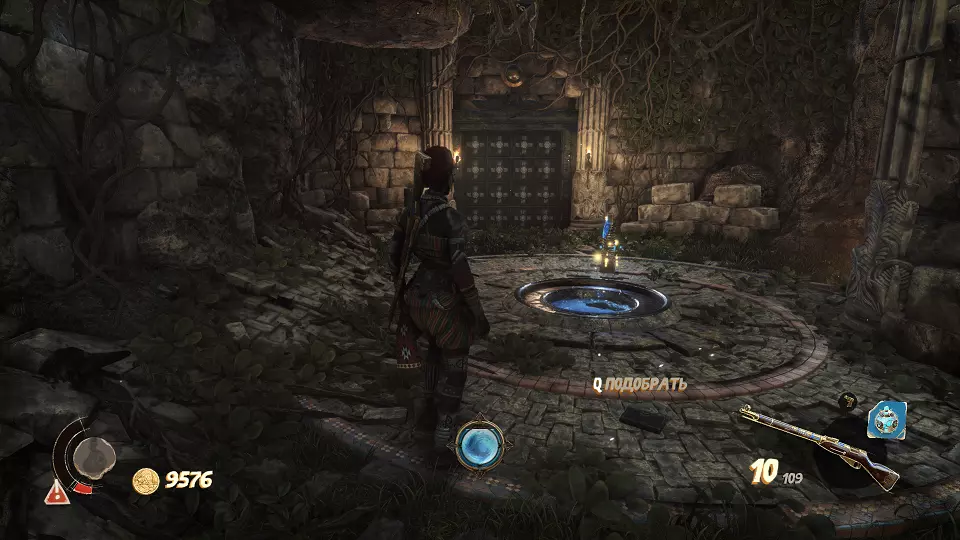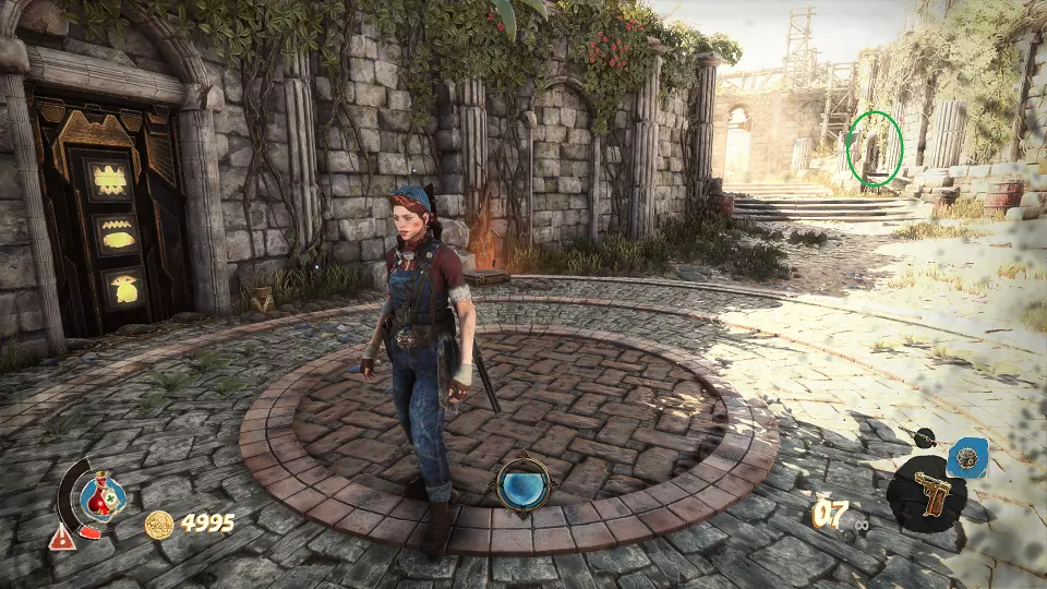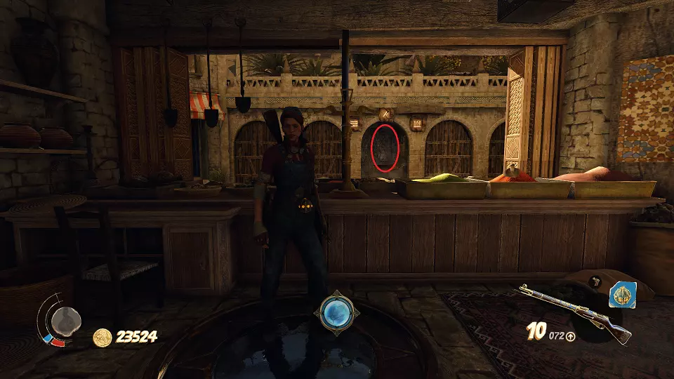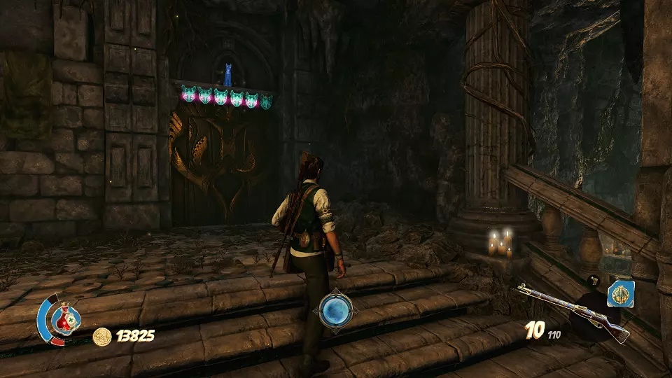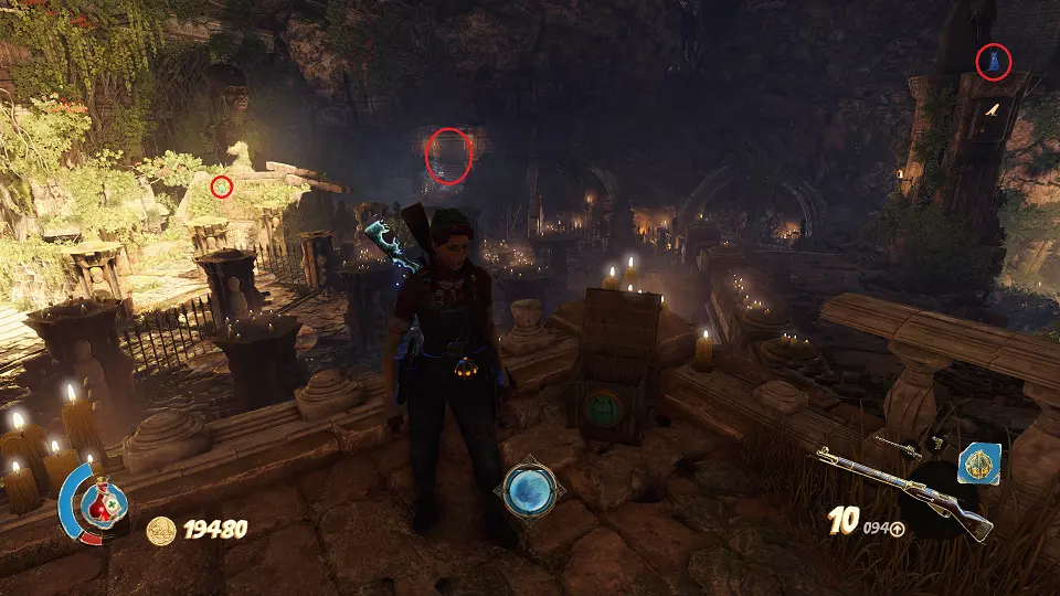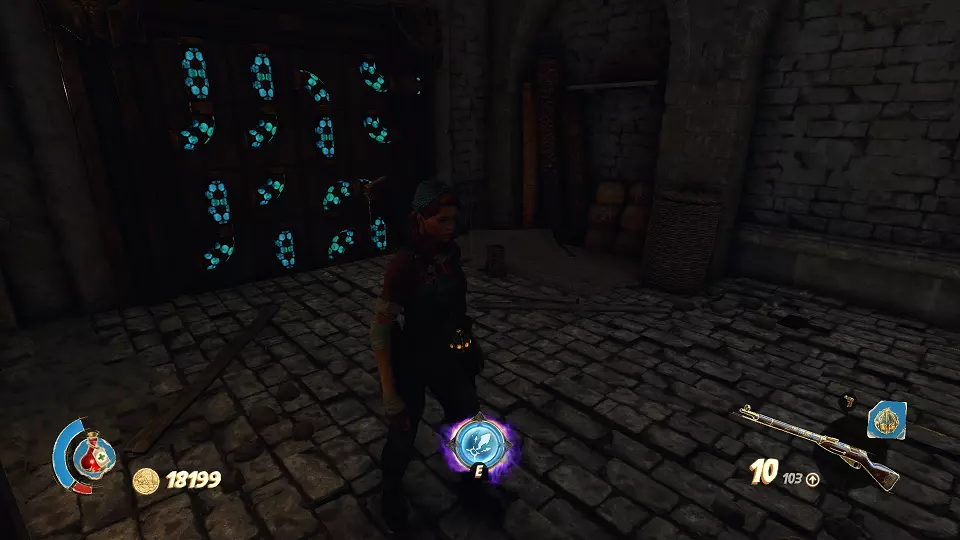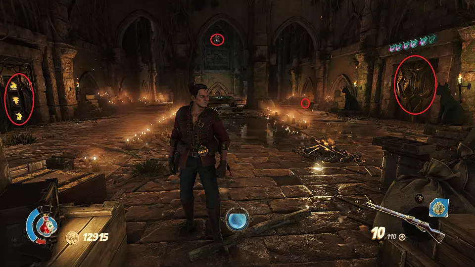圣物(3/6) 在此处左转,走向带有铃铛的门。需要按正确顺序射击这些铃铛。