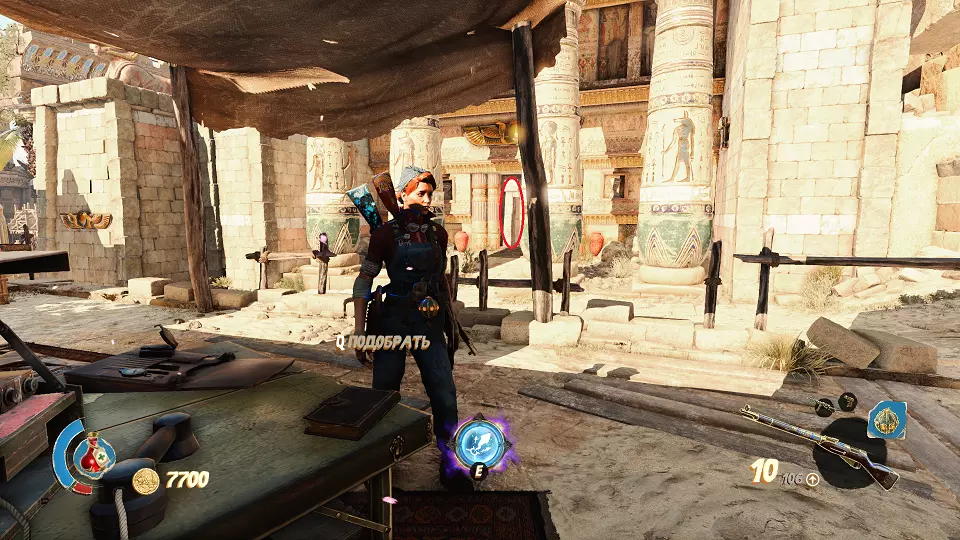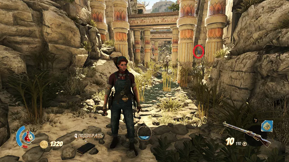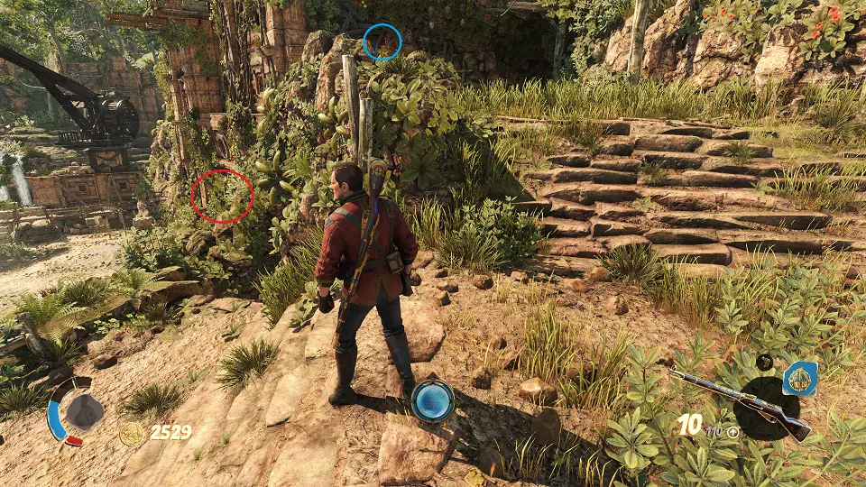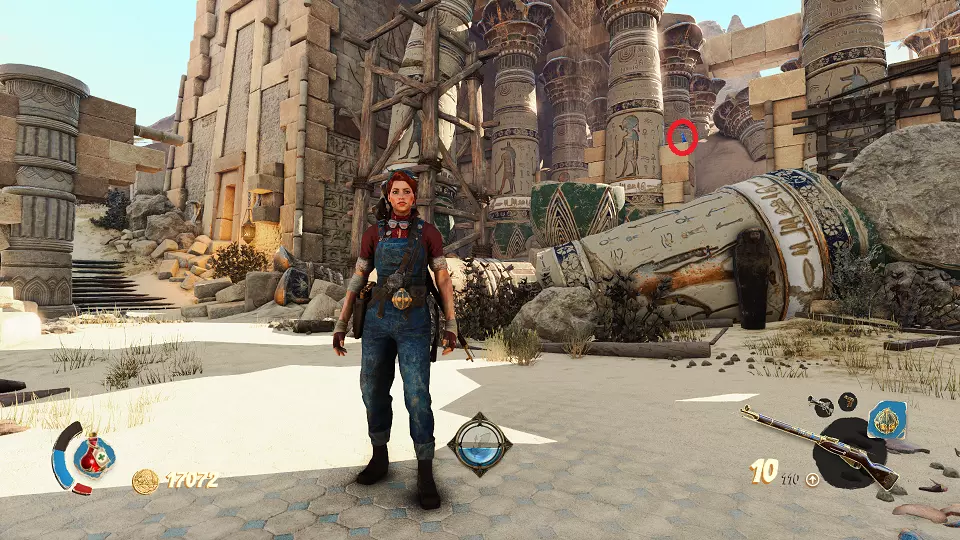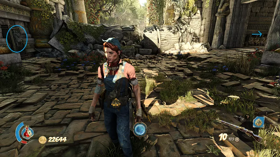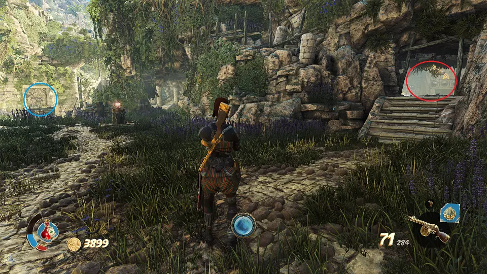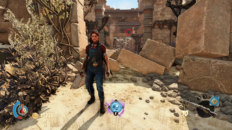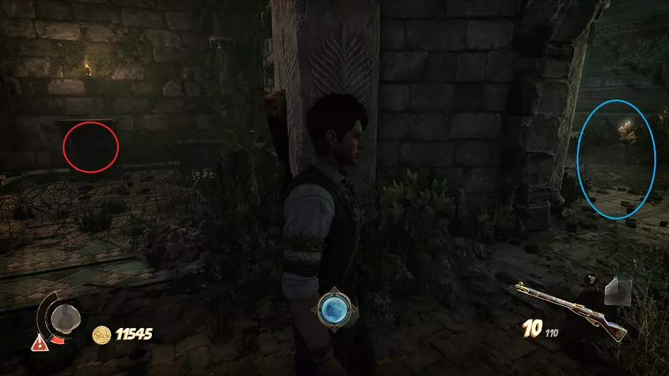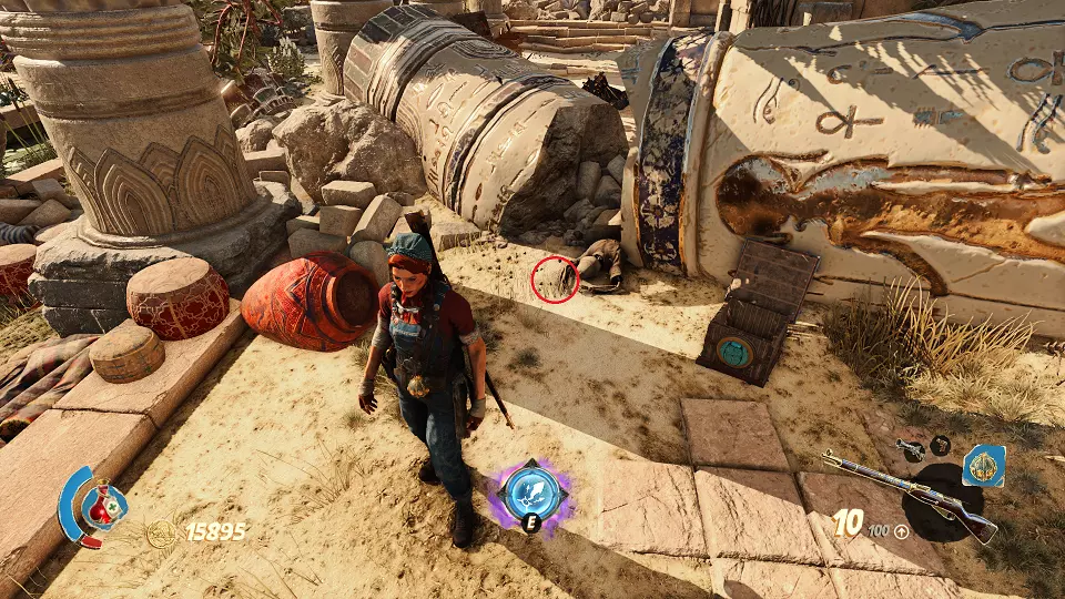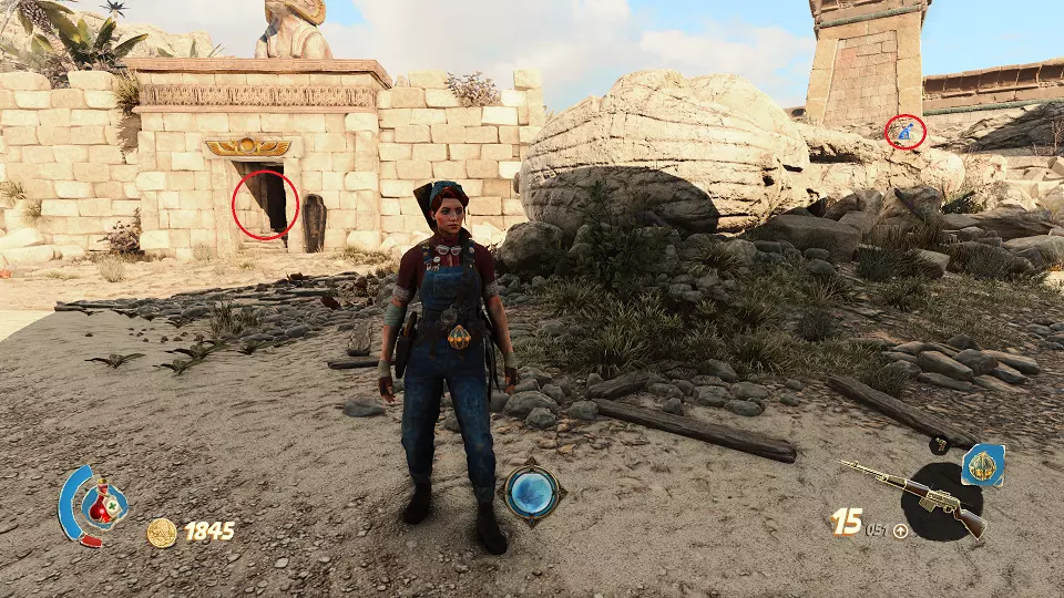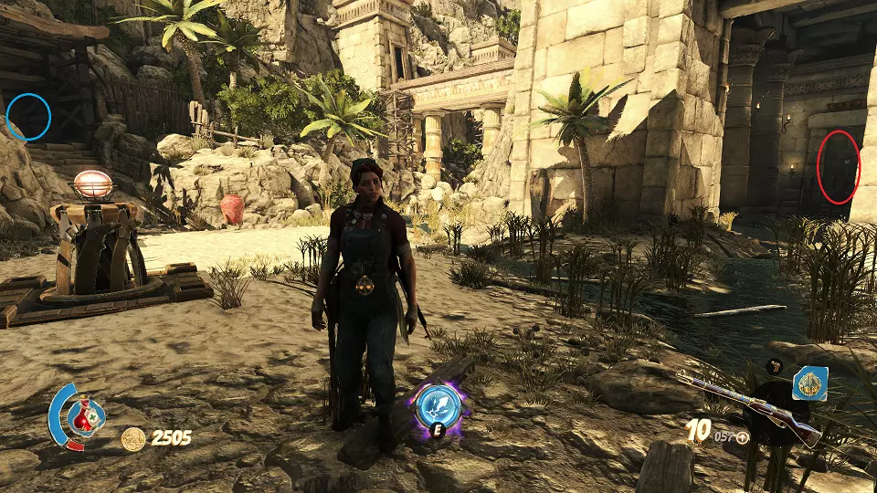 遗物(1/6) 日记(2/7) 在关卡中第一个圣甲虫钥匙的采集区域。解谜门(红色标记)在前往该区域的路上还能看到,可从右侧通道(蓝色标记)打开。里面既有遗物也有日记。