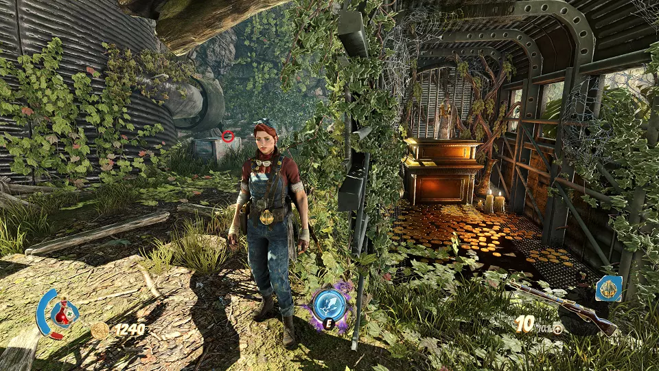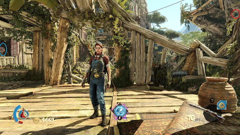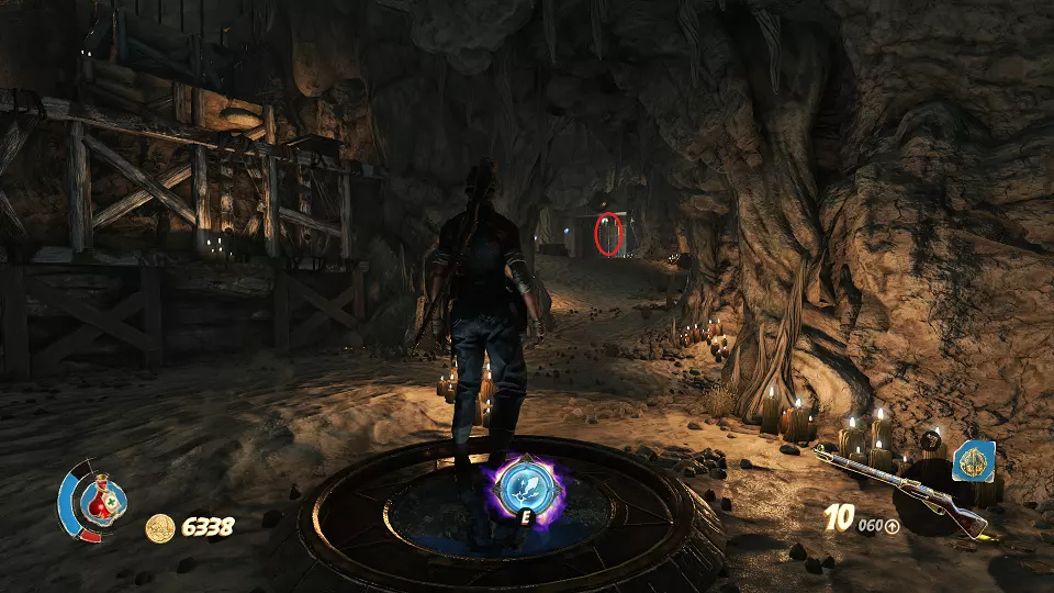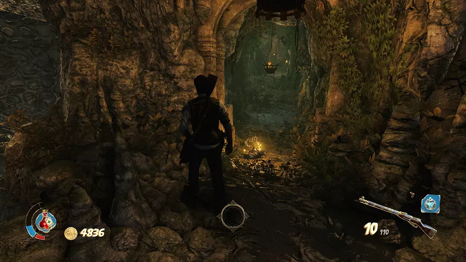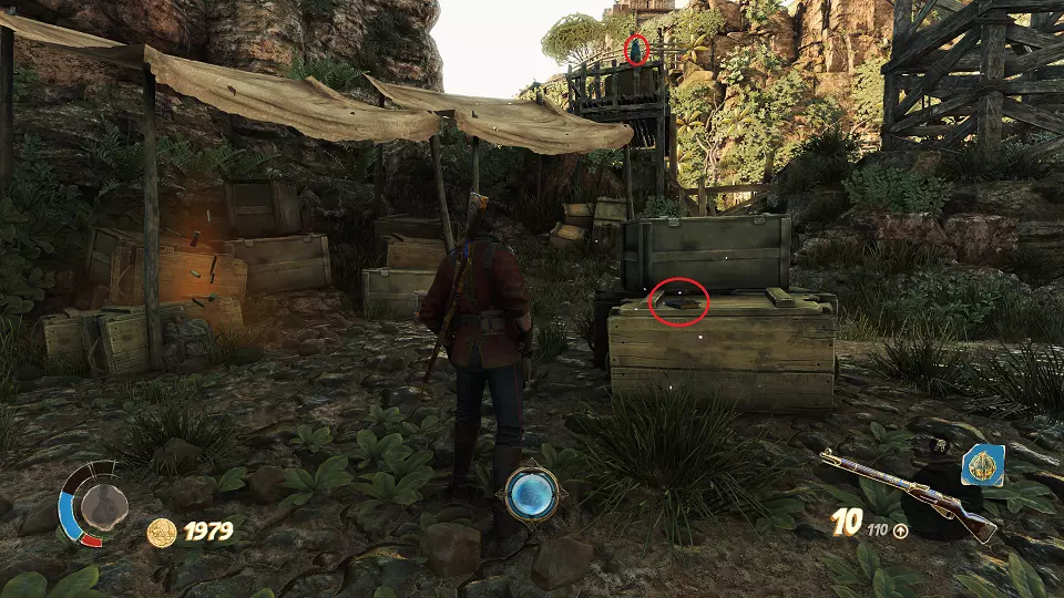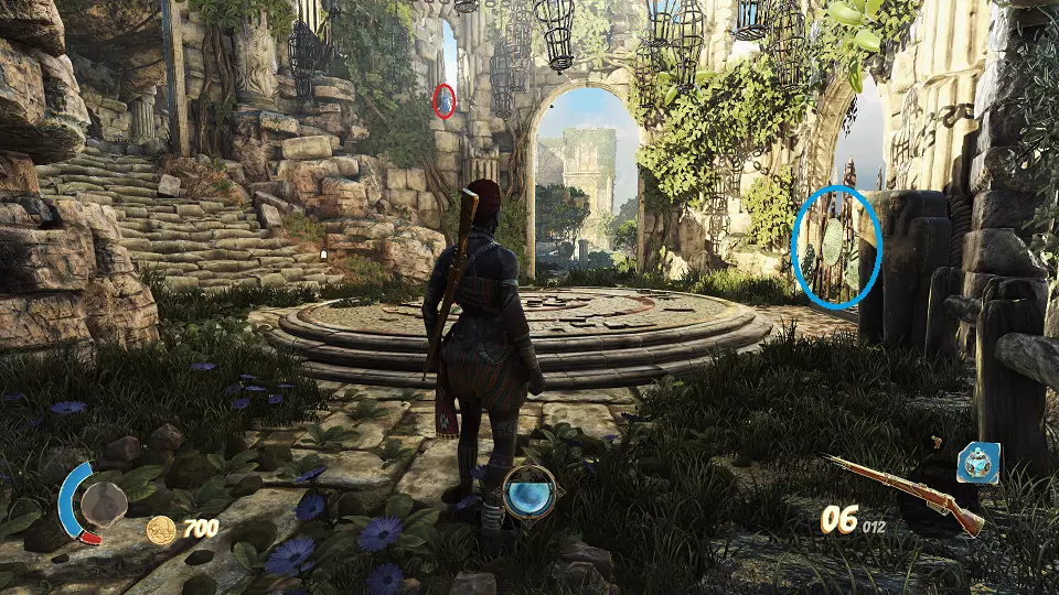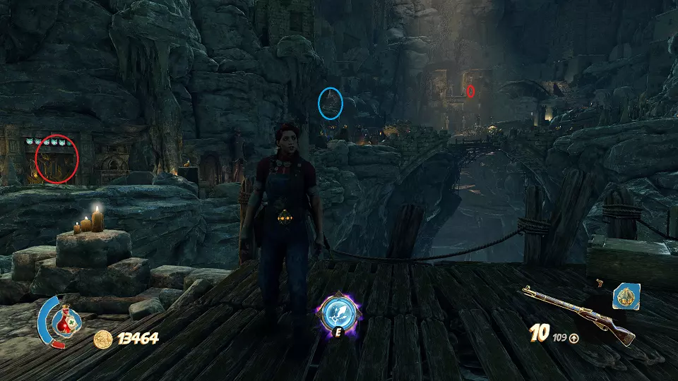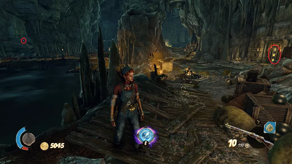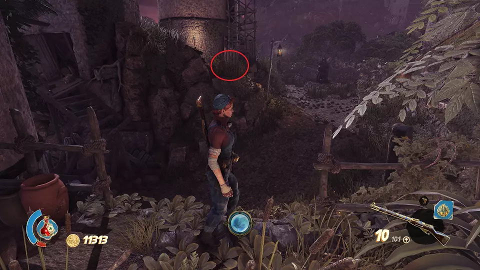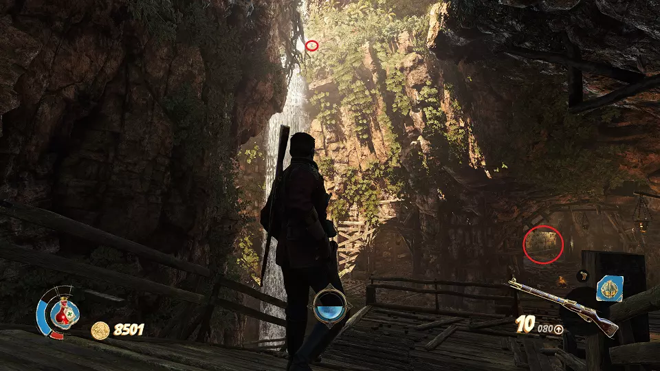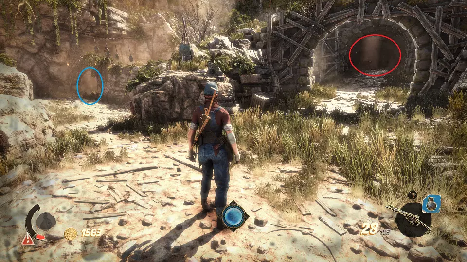 2. 隐藏山谷 urn(1/4) urn(2/4) 在关卡开始时,走出洞穴并向前走到桥上。从桥上向右看,桶上方可以看到一个urn,左边的柱子上有另一个urn。