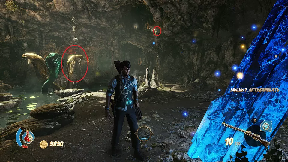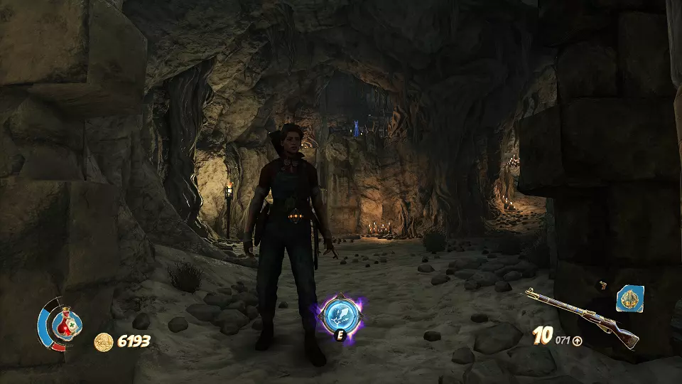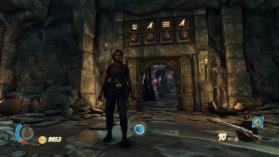 遗物(5/6) 接下来你会进入一个洞穴,需要找到圣甲虫钥匙。左边标有蓝色记号的就是那把钥匙,右边则是带门的谜题。