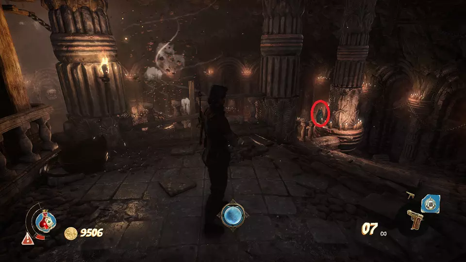 遗物(3/6) 用圣甲虫钥匙开门后,你会进入一个区域,在这里将首次遇到持矛的敌人。过场动画结束后,会有一个背上背着遗物的敌人向你跑来。 记住:必须快速消灭这类怪物,否则它们会消失得无影无踪。