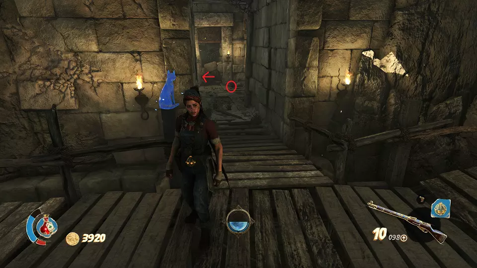 日记(5/5) 猫咪雕像(6/6) 骨灰瓮(4/4) 黄金猫咪(1/1) 穿过下一座桥后,会发生另一场大战,你还会看到一段楼梯,矛兵会持续向楼梯射击。击败所有敌人后,在楼梯右侧打碎易燃的花瓶,花瓶后面有一条通往纸条的路。然后沿着楼梯向上走一段,你会看到最后一只猫,它旁边有一扇门,通往有【黄金猫】的区域(红色箭头)。而通往最终战斗的门上方,能看到最后一个骨灰瓮。