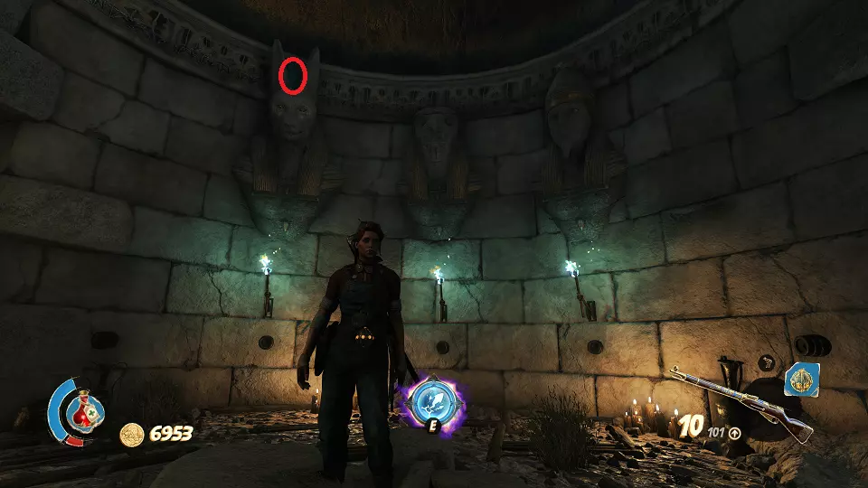 猫雕像(4/6) 在关卡中拿到第二个圣甲虫钥匙的区域后,穿过打开的门,前方就能找到猫雕像。