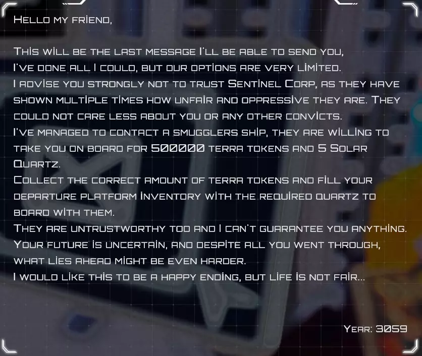 【服从】: *如果你查看收件箱中的最后一条消息,会看到它提醒你不要信任哨兵公司,并且走私者会在特定条件下带你登上他们的船。 莱利的消息