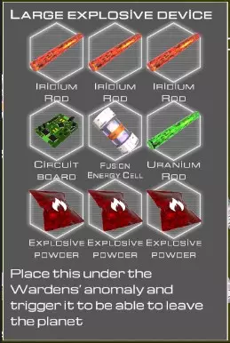 注意:当玩家的地球化指数达到4 TTi(完全地球化阶段)后,将收到来自【Sentinel Corp】的信息,内容涉及探测到的异常现象,同时会获得上文所示的用于清除该异常的配方。【大型爆炸装置】蓝图无法通过其他任何方式获取。