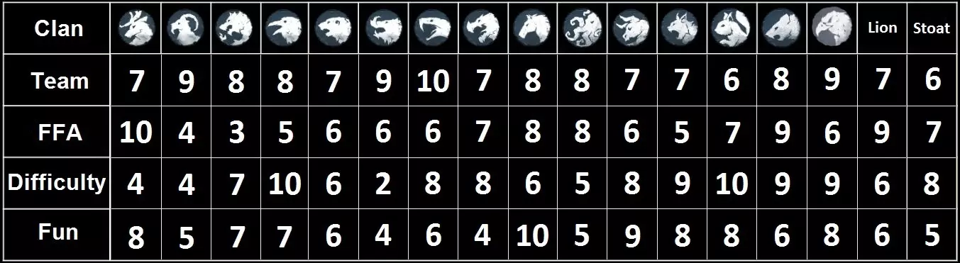 Difficulty means how much actions and decisions you need to do to succeed in the game. Clan Learning curve from Easy to Hard.Boar Goat Bear Stag Wolf Kraken Lion Rat Horse Dragon Snake Eagle Ox Raven Squirrel Stoat LynxThe list is based on my own experience. It shows how difficult to achieve average level with chosen clan. For example, Boar is the simplest one. You can play 1 game, and the second run will be OK game for you. On other hand you need to play at least 10-15 games as OX to figure out build order, battle spec, way of playing and etc. Owl clan is out of lists because I didn't play it yet. Teams As I said, all clans can be played in this mode. Anyway, some clans are much stronger than others in current meta. Tier A - Good optionHorse Stag Eagle Goat Snake Boar Wolf Bear Kraken RatTier B - Can be goodLion Dragon Squirrel Lynx Stoat Ox Raven FFA Some clans in FFA are absolute outsiders. I divide all clans into 4 categories. Tier A - Great most of the time.Horse Stag Kraken Rat LionTier B - Good in partial circumstances.Eagle Bear Dragon Squirrel StoatTier C - Playable but not great. A lot of weak sides.Snake Boar Goat OxTier D - Can't do much most of the time.Raven Lynx Wolf FFA - Quick Review Main rule of FFA is to pick a clan which strong in late game (after 803). Usually noone really fights. If you start a fight with a neighbor early, you will stop the development of your eco. And even if you win - other player will gather strength and win. So, everyone just making eco first 2,5 years. Yeah, sometimes there are games with Eagle presented. But they can be defended. How to win in FFA. 1) Take late game clan 2) Plan your final goal - win with Lore/Fame/Domination. 3) Develop your economy to be ready for war. 4) Scout neighbors. If there Stag in the game - you need to find him. Because Stag can easily win with Fame in 803. When nobody else can. 5) Start fighting. If you will make your economy too long - someone else just win. So, you should feel the pulse of the mission. Remember one thing. If you become a leader - everyone will start attacking you. And even if you can defend 2 players, third just come and finish you. So become a leader only if you have a plan. The safest way to win through Domination. The fastest one with Fame win. You just to kill 1 neighbor, reach ~1000 fame. Take 10 tiles. And start gathering food. You need to have big crown stock in case you will be attacked by some else. When you will get 1500 food, colonize 3 tiles, make feasts, upgrade some building. You will reach needed amount of fame and need to wait 1-2 month to get food for the last 14th tile. Also, you can buy on the market. Nobody won FFA with Trade victory for decades. Special map conditions is not an option too. You will just get to much attention. Lore Victory was an option in previous Meta. Now it takes too much time. You will be just overwhelmed. Best clans for FFA now are Stag, Lion, Rat. Teams - Quick Review Team games with 3v3 are the most balanced match you can have. You can win with any clan in this mode. But coordinating with your teammates is essential for the win. Usually, team decides who will take Clearer ( Wolf / Eagle / Lynx / Bear). If Clearer presents in the game, it can boost economy of teammates during the first year. You can try to play without Clearer if you are sure you can clear tiles themselves. In that case you are also is too vulnerable for early attacks of enemy Clearer. For example, enemy Wolf come in the end of 801 with chief and a couple of units and you are in trouble. So, first rule of winning in teams. Communicate with teammates during lobby time and decided what clans you need to pick. If you won't coordinate your moves with teammates - you will lose for sure. Second rule is to choose your plan. You should a date when you will attack. In my own experience, the team which attack first wins in 75% of games. Usually, all fights start in 802. Some clans are ready for fight sooner and some are ready later. You should find the date which fits for all teammates. Also, it would be wise to pick clans during lobby time. Third rule is to decide who will scout. Most of the game are lost when enemies come from nowhere. So, you should always tell you teammates what you got scouted. Getting scouted usually means you will be attacked very soon. This time is essential to make preparations to stack food, make camps and etc. Anyway, it won't happen if you will scout your enemy sooner when he scouts you. So, decide this matter in the start of the game. Fourth rule of winning is pick proper clans. For example, if you see that enemy has Clearer + Wolf or Clearer + Boar and etc. It definitely means, they will rush you. And if you pick late game clans, you just have no chance to defend them in 801. So, always try to counter-pick them. Fifth rule is to try to help your teammates. Help them clear when they ask. Make feasts if you can. Distribute important tiles with food/stone/iron. Transfer tiles in some situations. Finally, the game should bring fun to you. So, try to find your favorite clans for Late and Clearer purposes. And play them. Try to get out from noob pit and reach at least Iron league (400+pts). Teams games there are much more strategic and more fun. I. Stag Absolute late game clan. One of the weakest clans in the start, but it starts shining after 803. Making good economy with upgraded buildings is a core part of gameplay. Also, Stag requires and generates a lot of Fame. Clan relic gives an access to an improved version of warrior with more damage, health and resistance. In addition with high gold income and big population allows to dominate in the late game. But most Stags play through Happiness relic which greatly improves Stag economy. It has a lot advantages:(FFA) A lot of ways to win. It can with Fame, Lore or via Domination. The strongest economy after 803 (a lot of upg. buildings, fame production bonus and altar bonus). Stag army (with relic) and some upg. barracks is 
