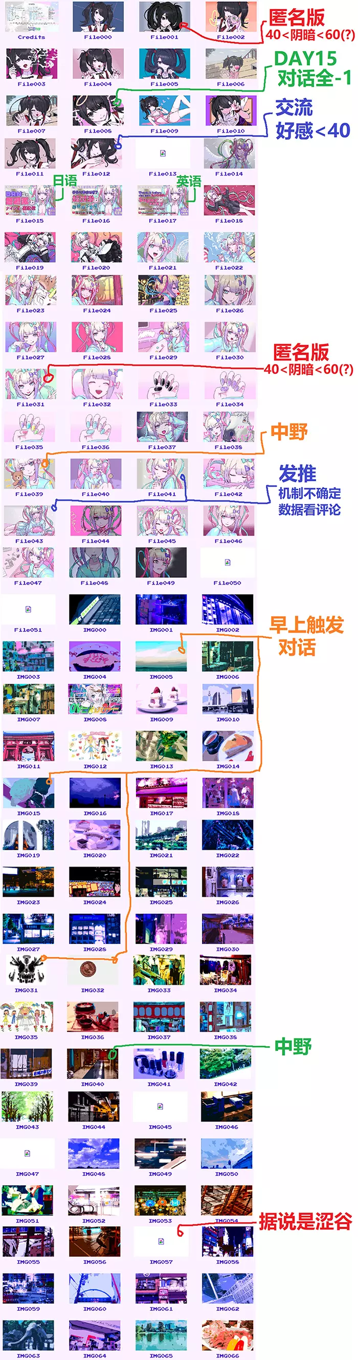 Chesed提供的File13获取方法:在第14天左右将好感度和阴暗值刷到60以上(不要超过太多,上限尚未测试),保持该数值直到第15天或第16天,深夜会触发糖糖的小作文,作文内容随机,可截图或留意关键词。接着达成Utopian Parody结局,最后会出现一个选项,选择当时作文内容中糖糖的愿望,即可解锁该CG并改变背景。砂糖元司整理了按钮的变化,在刷图时非常有用,供大家参考: 交流(好感):0~39 聊天;40~79 温存;80~+ 互舔伤口 匿名版(阴暗):0~39 看评价;40~59 自导自演;60~+ 喷人 推博: 日常推文(粉丝<1万,阴暗<20) 恰饭宣传(粉丝>1万,阴暗<40) 发泄负能(粉丝<1万时,阴暗>20;粉丝>1万时,阴暗40-59) 追着别人喷(1万≤粉丝<10万,阴暗≥60) 抒情(粉丝≥10万) 并且砂糖元司还整理了图片的获取方法。 以下是我自己整理的集中有问题的图片获取方法,并不全。文件 1-匿名版-自导自演 2-玩游戏 3-魔法香烟 4-阴谋论2 6、7回老家 8-第15天对话-压力 9-秋叶原 11-天使大讲堂2 12-交流-聊天 13-第15天触发作文、乌托邦模仿结局选择作文内容 18-出门-涩谷 19、20-出门 26-魔法香烟 27-色色 28-闲谈1 29-福利直播4 31-匿名版-自导自演 33~36-早上美甲对话 38-NTR结局 39-中野 41-推博-追着别人喷(?) 43-推博-发泄负能 44-网络都市传说1 45-第一天自动解锁 47-安眠药 图片 3-秋叶原 5-早上对话「不如结束一切去看海」选好 9-交流-聊天 15-早上对话 16-交流(?)17~20-原宿 21-出门-市谷 23~30-池袋/秋叶原 31、32早上对话 33、34、60下北泽 40中野(阴暗<60) 41-原宿 44-OD 45-推博-日常推博(好感需要≥80) 46-交流-温存 48-交流-温存 51-视频网站 53、55、56、58、59-出门-涩谷 57-处方药适量 63~出门-上野 66-匿名版-看评价 哈布斯堡 2月17日 下午9:03