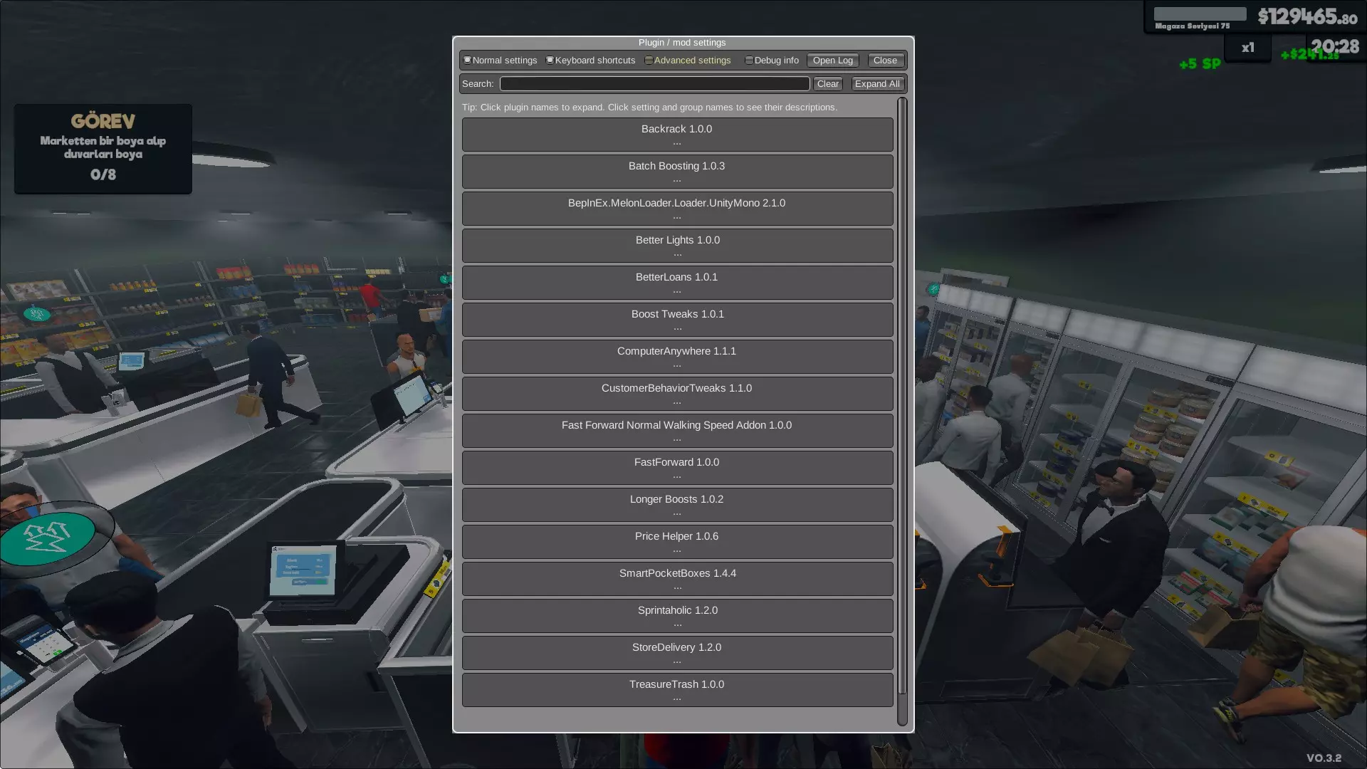 在不把游戏过度简化而失去乐趣的同时,又能防止我们感到无聊而关闭游戏,这里是我自己使用的、用于完善游戏不足的模组。 引言 开始之前 这篇文章的目的是为我自己记录我使用的模组。既然写都写了,我想不如整理一下分享出来,让大家也能受益。游戏目前版本为0.6.0,本文中的所有模组在该版本下均能正常运行。随着我继续游玩,我会更新本指南。 实际上,我创建本指南是为土耳其玩家准备的,不会在指南中用英语解释这些模组。你可以访问下方给出的每个模组的页面链接,所有模组都已有英文说明。如有任何问题,你可以在评论区联系我。(我不是模组开发者,请勿向我反馈模组漏洞。)安装步骤 1. 首先需要安装的工具是Tobey's BepInEx x MelonLoader Pack for Supermarket Simulator - 安装很简单;将压缩包中的所有文件解压到游戏文件夹中。(在Steam上右键点击游戏,选择浏览本地文件) - 如果你是Linux用户,需要额外在游戏启动选项中添加以下命令:WINEDLLOVERRIDES="winhttp=n,b" %command% - 启动游戏一次然后关闭。 2. 用于在游戏内进行模组设置的工具:Bepinex Configuration Manager - 将压缩包解压到游戏文件夹中。(在《超市模拟器》的BepInEx/plugins/ConfigurationManager文件夹中应该能看到相关文件) - 现在在游戏内按下F1键,将会打开一个显示所有已安装模组的窗口,并且所有模组的设置都可以在该菜单中进行调整。