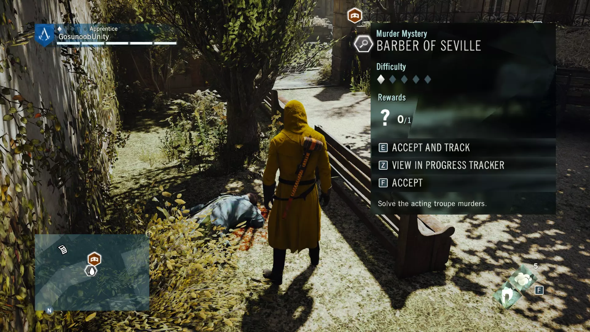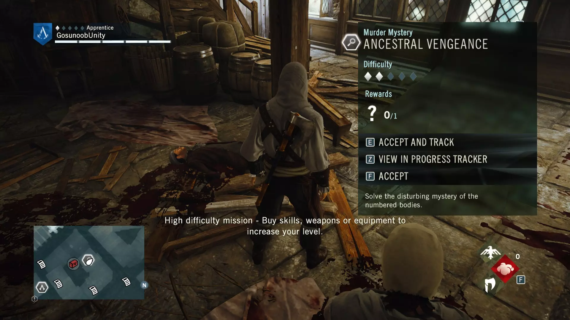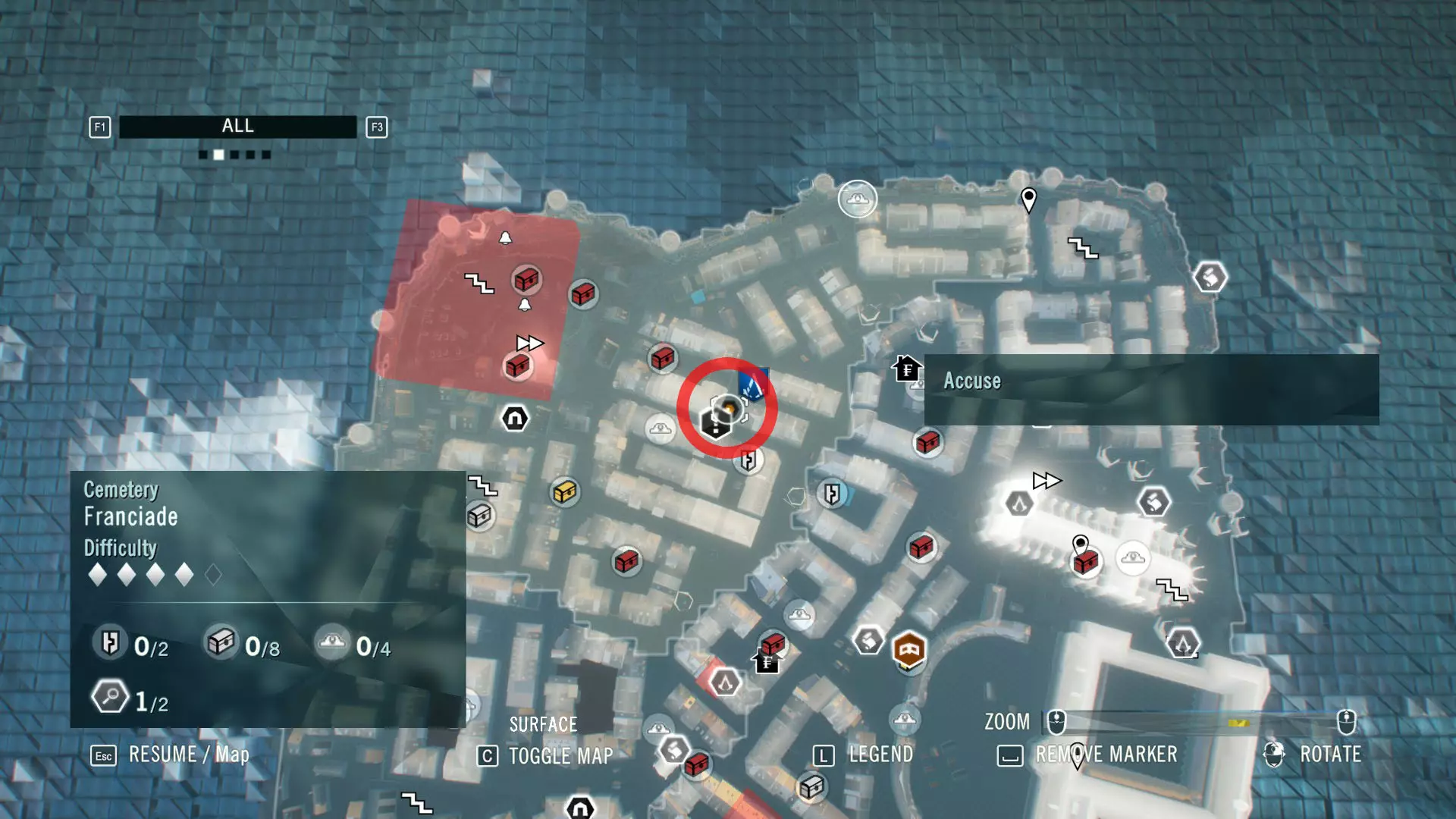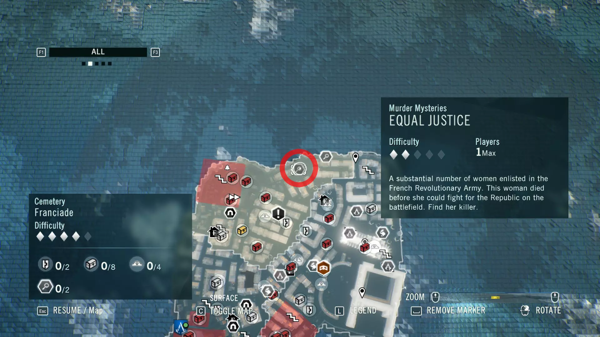 我还包含了法兰西亚德的谋杀案,数量不多,但由于该DLC已包含在主游戏中,所以我也将其收录进来,你得好好利用这一点。 Blind Justice ⧫◊◊◊◊ ⚰️ 神秘事件从哪里开始?事件发生在法兰西亚德北部的墓地区。完成序列13记忆3【过去的阴影】后,它会显示在地图上。这是《刺客信条:大革命》中最简单的谋杀之谜,因此难度等级为1/5。这也是为什么该谋杀之谜只奖励2500里弗尔,且没有装备奖励。相当令人失望且枯燥。