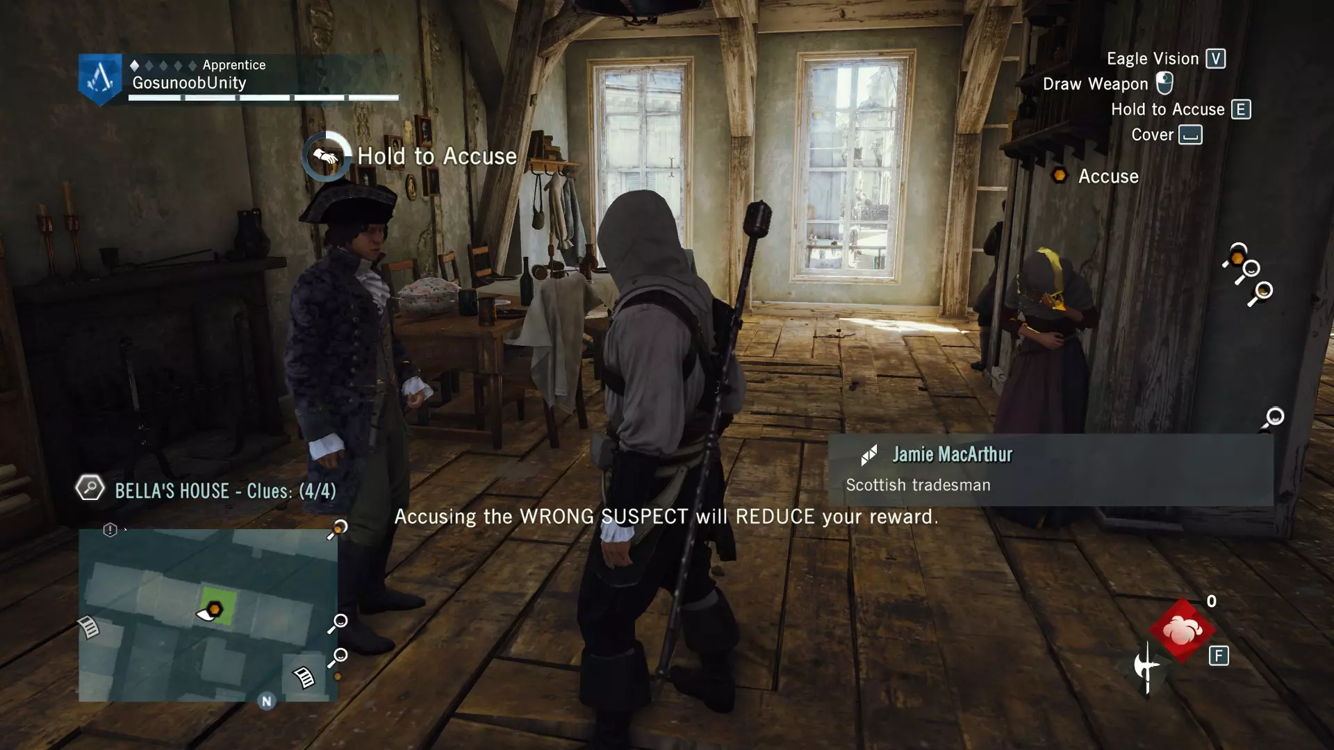 谁是凶手?回到贝拉的家。找到并指控杰米·麦克阿瑟。传送后,与警察局长交谈以获取最高奖励池。