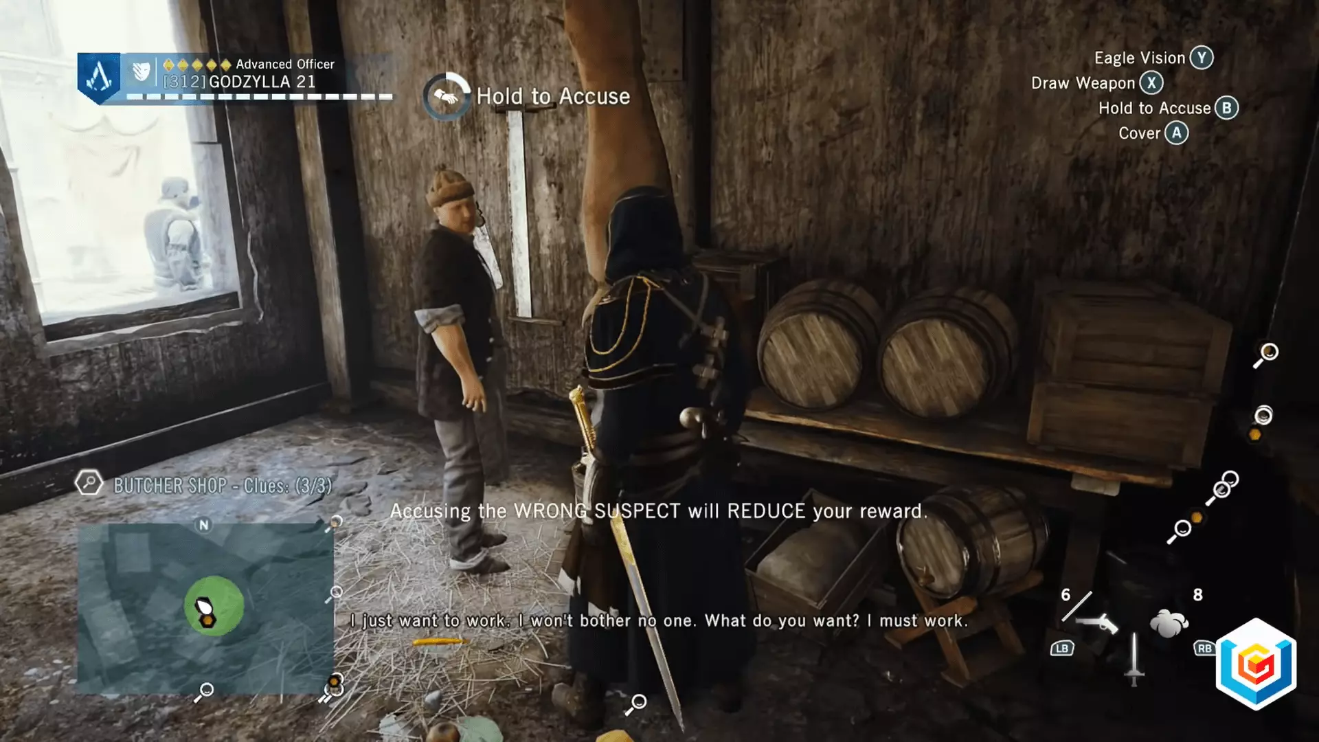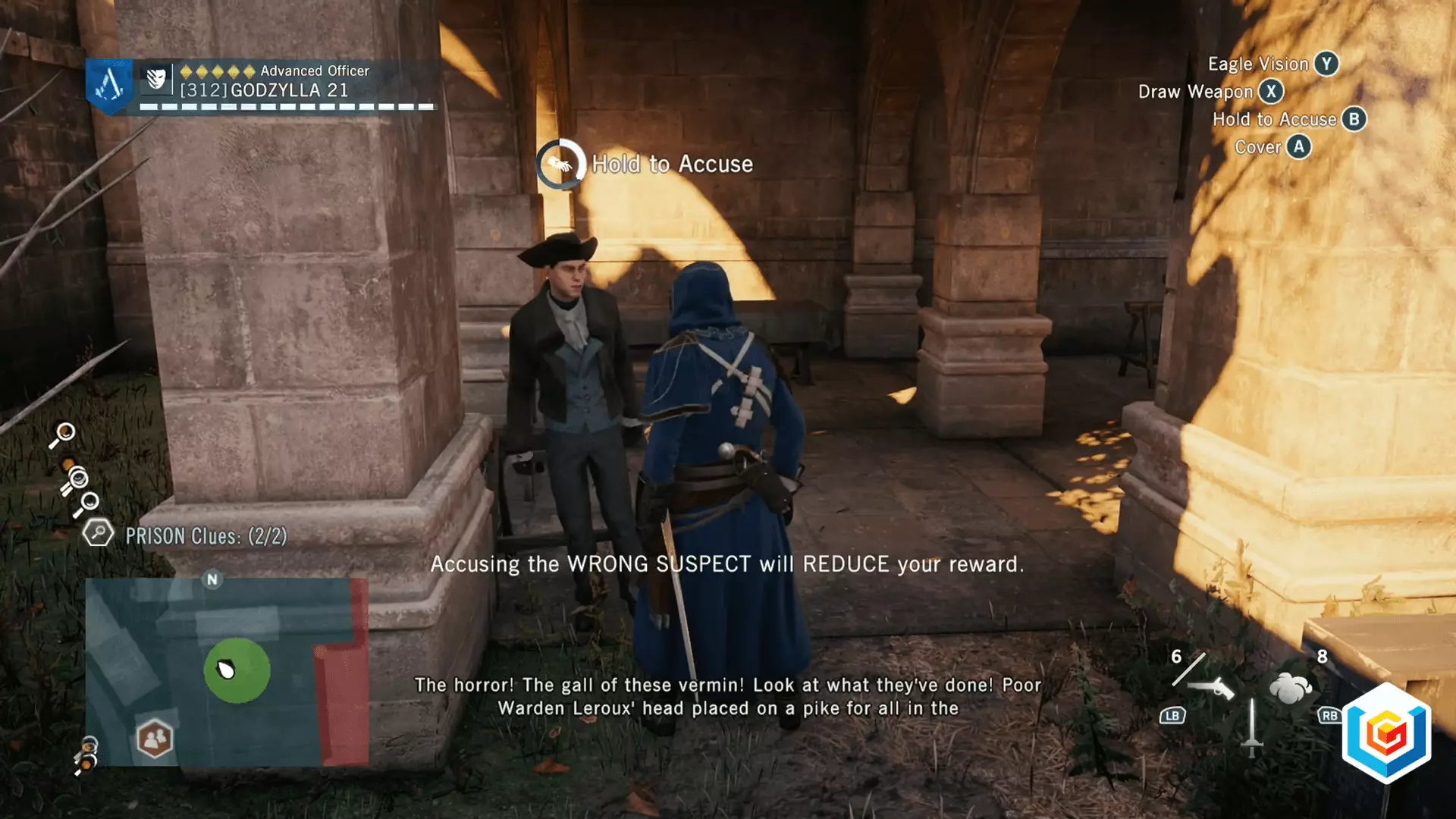 奖励:收集所有线索并指控正确的嫌疑人后,你将获得主要奖励——长武器【Cogneur】。你可以花费500信条点数升级该武器,获得25%的额外伤害。