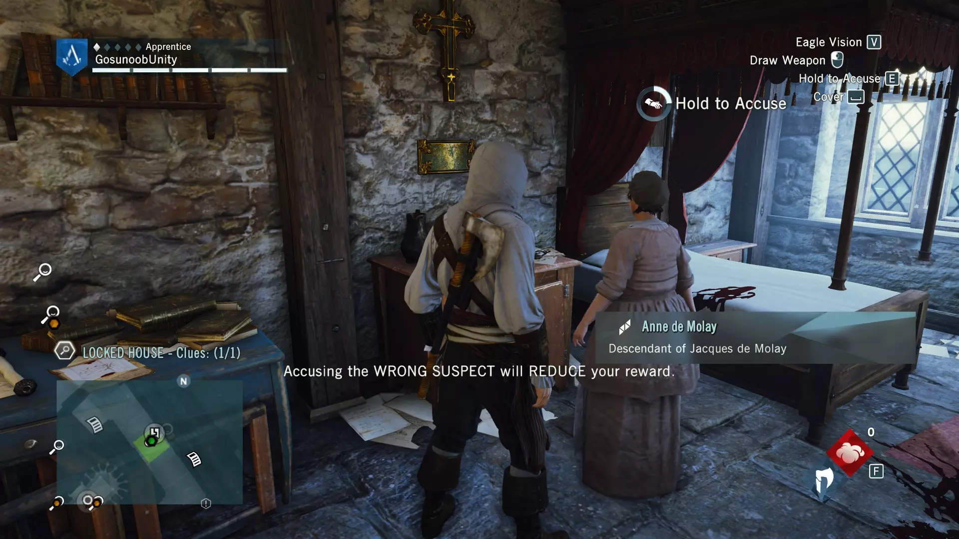 谁是凶手?找出凶手其实很简单,因为凶手的血迹会指引你找到他。最后一幕发生在锁着的房子里。指控安妮·德·莫莱可获得最高奖励。