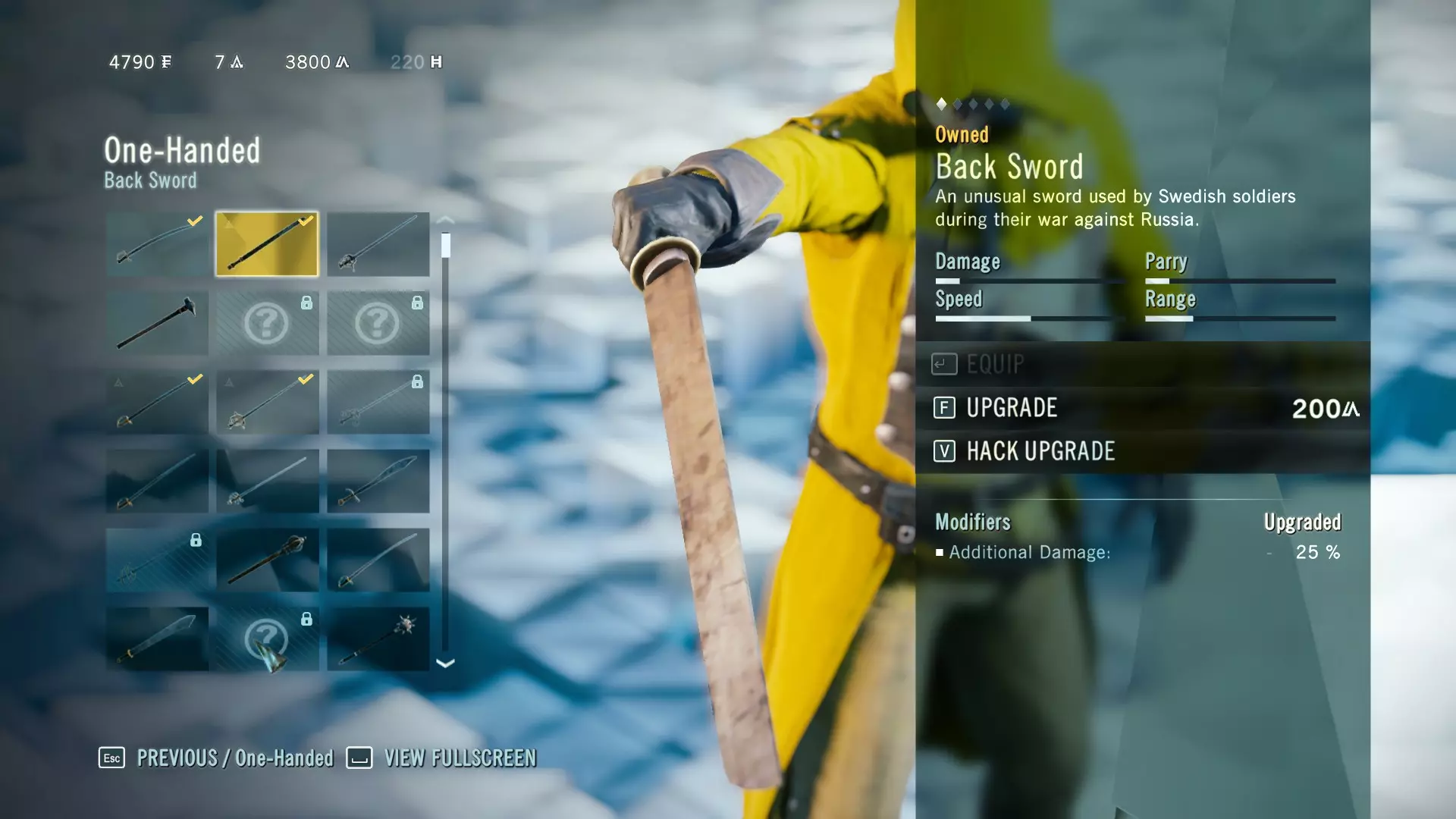 主要奖励是一把单手剑,名为【背剑】(一种瑞典士兵在对俄战争期间使用的特殊剑)。若要获得25%的额外伤害,需消耗200点信条点数。