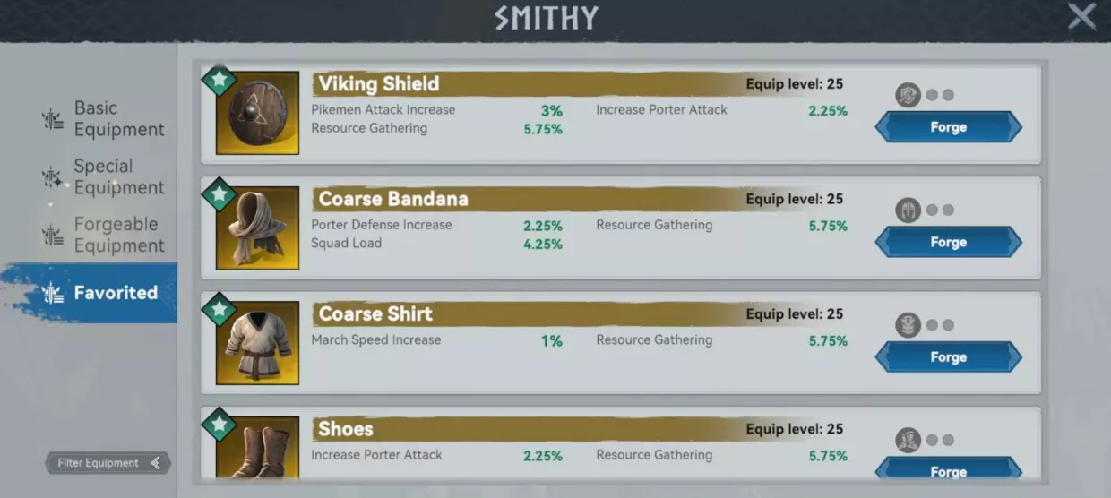 2. 装备 为了最大化采集速度、效率和负载,需为采集英雄装备以下物品。此类装备的主要用途是获取采集属性加成。 装备 | 最低品质(普通) | 最高品质(传说) ---|---|--- 武器:维京盾牌 | 采集效率:1% | 采集效率:5.75% 头盔:粗布头巾 | 采集效率:1%<br>小队负载:0.5% | 采集效率:5.75%<br>小队负载:4.25% 铠甲:粗布衬衫 | 行军速度提升:0.2%<br>采集效率:1% | 行军速度提升:1%<br>采集效率:5.75% footwear:鞋子 | 采集效率:1% | 采集效率:5.75%