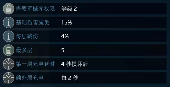 名称:13a 重型战术护甲 数量/使用次数:1/无限 持续时间:无限(被动) 效果:被动,被攻击时消耗一层减伤来减少受到的伤害(包括友伤)
