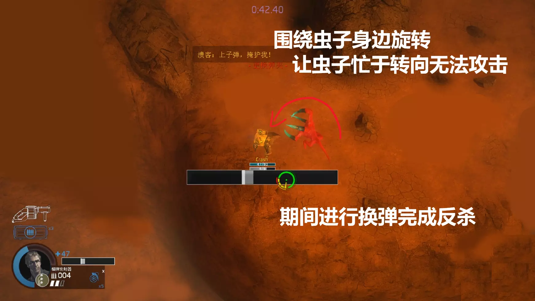 当电锯前方刚好刷新猛攻时不要犹豫,快速往电锯的身旁发射榴弹使虫子进入硬直状态,并利用范围伤害解决敌人。电锯在面对猛攻时,如果位置足够好,可以确保不会被虫子攻击到,并在猛攻情况下坚持一段时间。如果位置不佳且没有电甲,必定会迅速被击败,所以处理猛攻非常重要。 榴弹视角⑤——帮助电锯处理大型敌人并应对后续猛攻