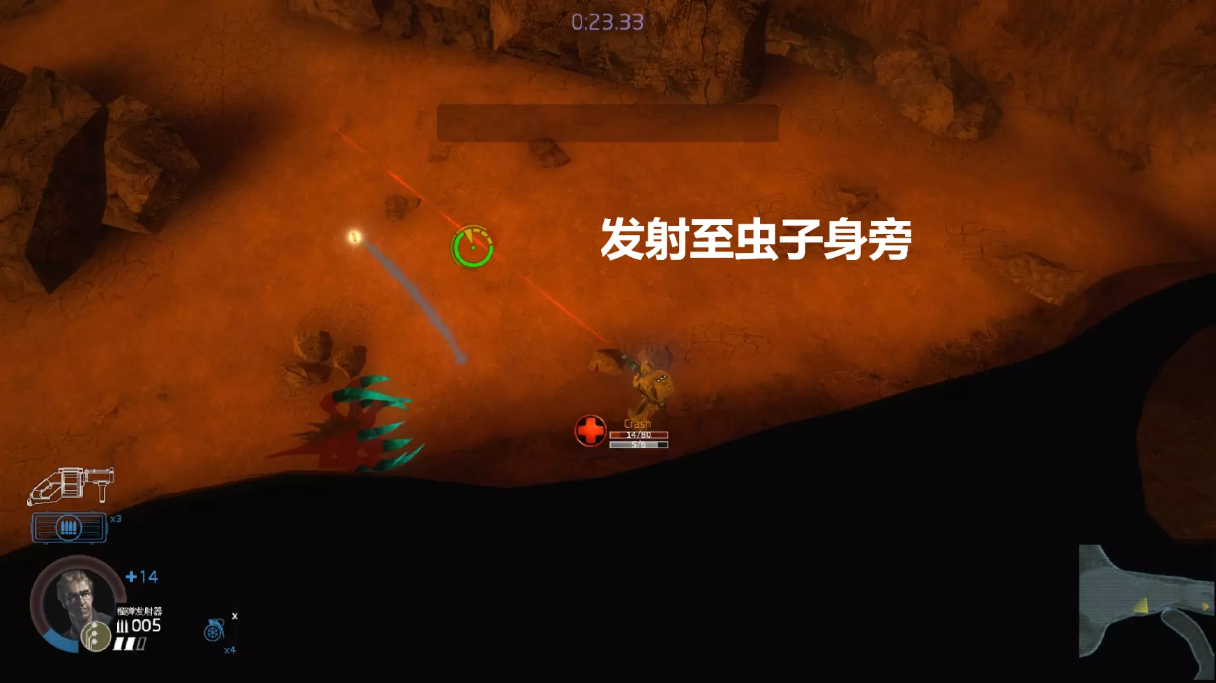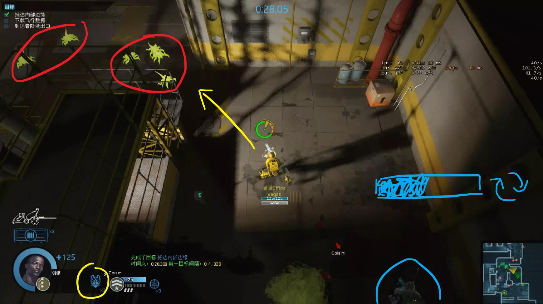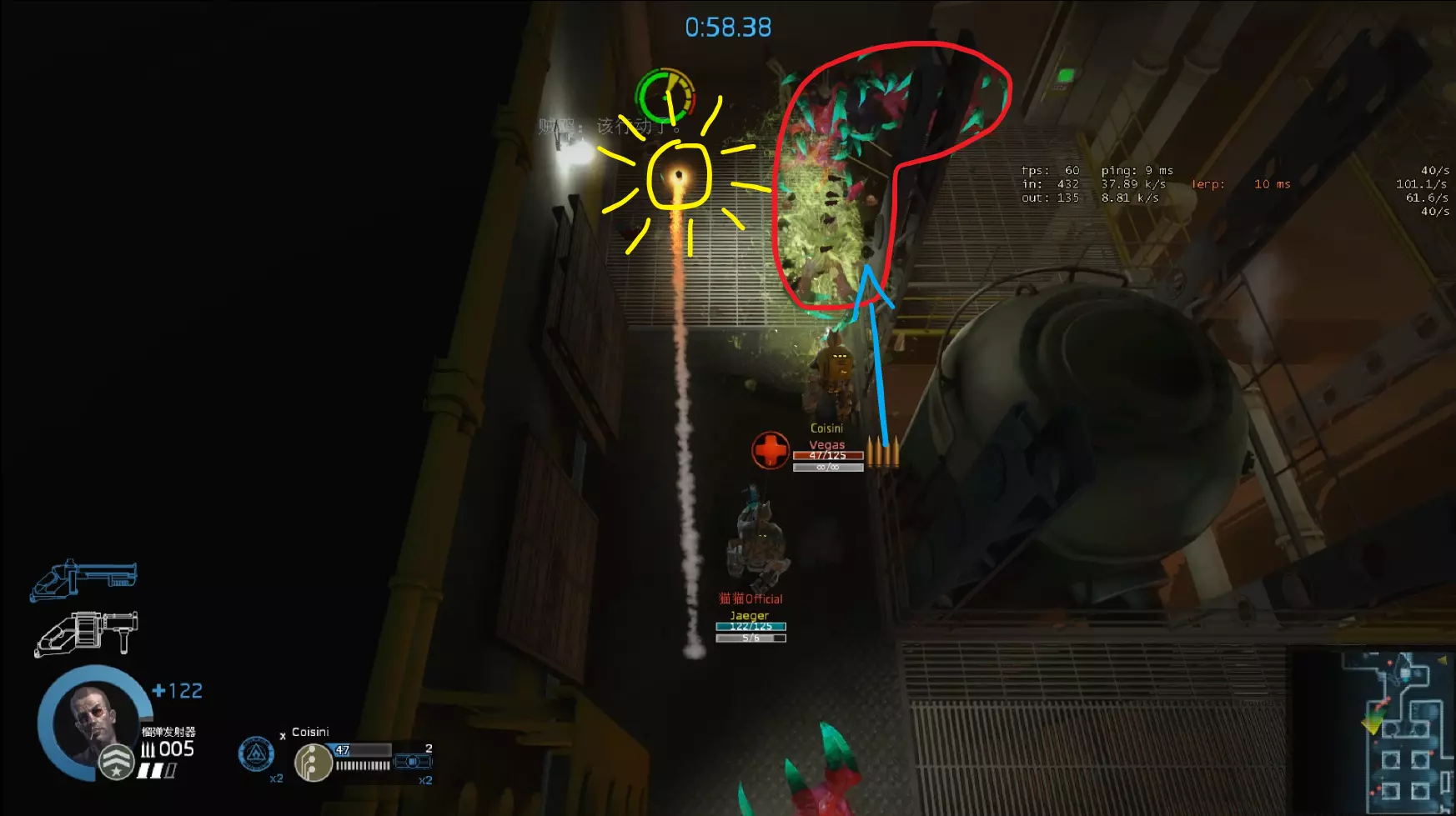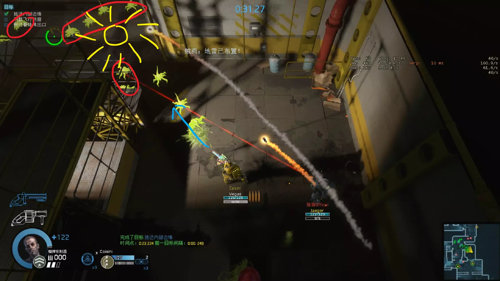 右侧电锯负责锯门,榴弹兵在放置火雷后补充弹药,并清理电锯后方的大型敌人(如大龙虾),为电锯争取时间。大部分需要守点的区域都采用这种守点方式。 #暗红色标记敌方初始目标 #绿色标记弹药 榴弹视角③——寄生虫清理