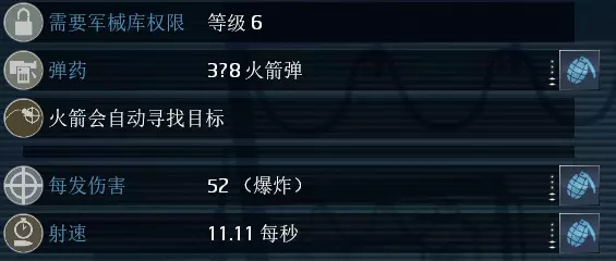 单次总伤:7(+1) 单发威力:每1点伤害加成技能提供1点额外伤害 武器射速:每1点工程技巧技能提供1.09倍额外射速 装弹速度:每1点换弹速度加成技能减少0.28秒装弹时间 辅助能力:每1点爆炸加成技能提供20范围加成