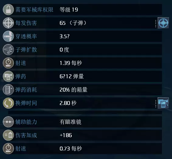单次总伤:65(+20) 单发威力:每1点伤害加成技能提供20点额外伤害 装弹速度:每1点换弹速度加成技能减少0.28秒装弹时间 辅助能力:射速从1.39降至0.73(降低0.66),增加186点额外伤害
