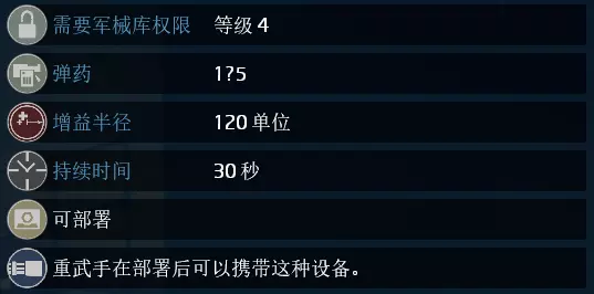 名称:X33 威力增强器 数量/使用次数:5/1 持续时间:30秒(武器专家使用时仅15秒) 效果:范围内的动能弹道类武器伤害翻倍;若由武器专家携带,装置将跟随武器专家移动。