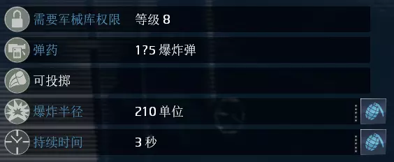 名称:SM75 战术照明弹 数量/使用次数:15/1 持续时间:30秒 效果:攻击照明范围内的敌人时获得自动瞄准能力【仅限于动能弹道类武器】