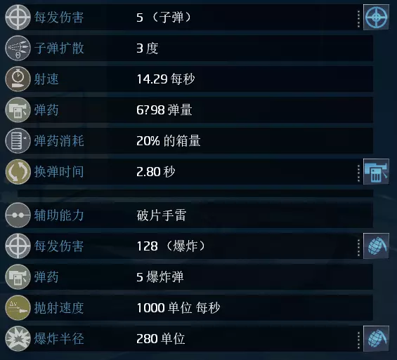 单次总伤:5(+1) 单发威力:每1点伤害加成技能提供1点额外伤害 装弹速度:每1点换弹速度加成技能减少0.28装弹时间 辅助能力:每1点爆炸加成技能提供20点伤害与范围加成