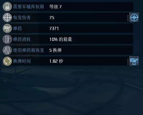 单次总伤:7(+1) 单发威力:每1点伤害加成技能提供1点额外伤害 装弹速度:每1点换弹速度加成技能减少0.14秒装弹时间