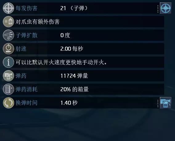 单次总伤:21(+4) 单发威力:每1点伤害加成技能提供4点额外伤害 装弹速度:每1点换弹速度加成技能减少0.14秒装弹时间 额外效果:对爪虫额外造成百分比伤害,两发必定秒杀一只爪虫