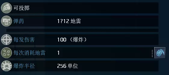 名称:ML30 激光式跳雷 数量/使用次数:12/1 持续时间:无限 效果:扔出一个激光雷(可放置在墙面上),敌人碰到光束会触发地雷爆炸(每2点爆炸加成技能使单次扔出的激光雷数量+1)